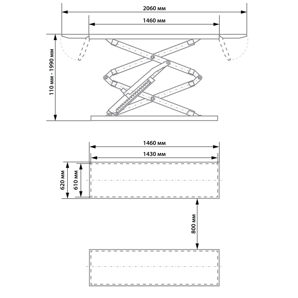 Подъемник рассчитан на грузоподъемность до 3500 кг, что позволяет обслуживать большинство современных легковых автомобилей. Регулируемая длина платформ от 1495 до 2035 мм обеспечивает универсальность и возможность работы с различными типами кузовов и колесной базой.