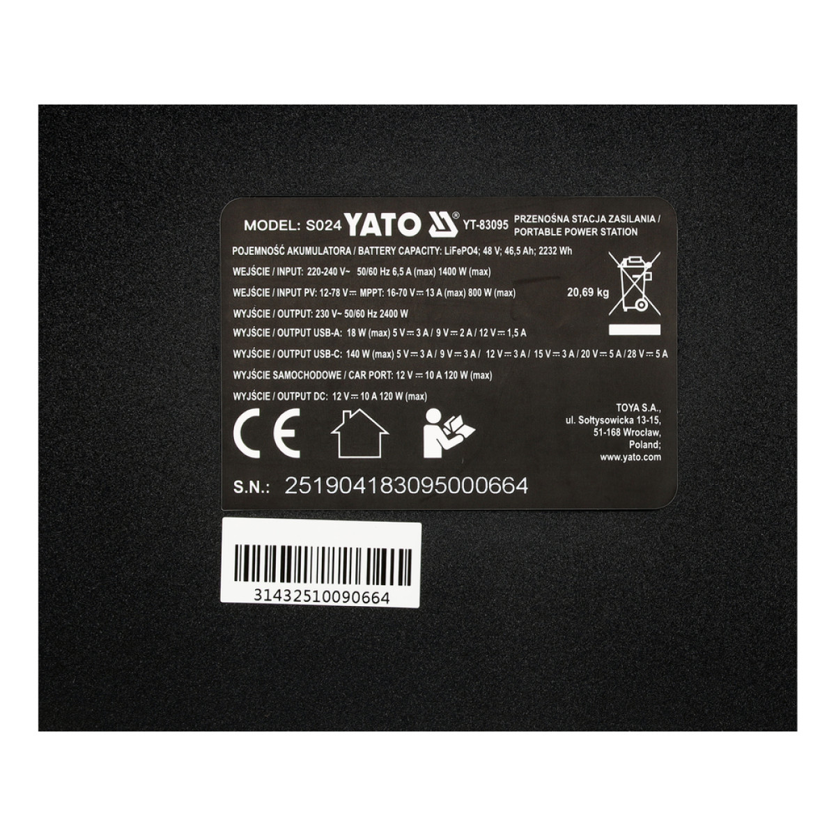 Портативная электростанция YATO YT-83095 - это мощный и надёжный источник резервного питания ёмкостью 2232 Вт·ч, оснащённый современной литий-железо-фосфатной батареей LiFePO4. Станция обеспечивает постоянную мощность 2400 Вт и пиковую до 4500 Вт, позволяя питать как бытовую технику, так и электроинструменты.
