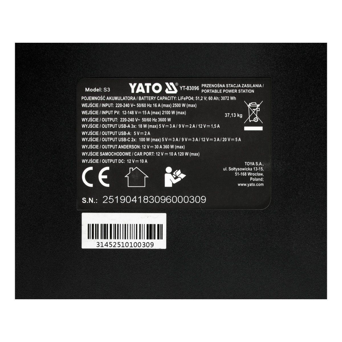 Портативная электростанция YATO LiFePO4 3600 Вт макс. 7000 Вт, 3072 Вт·ч 230V AC / USB YT-83096 - YT-83096