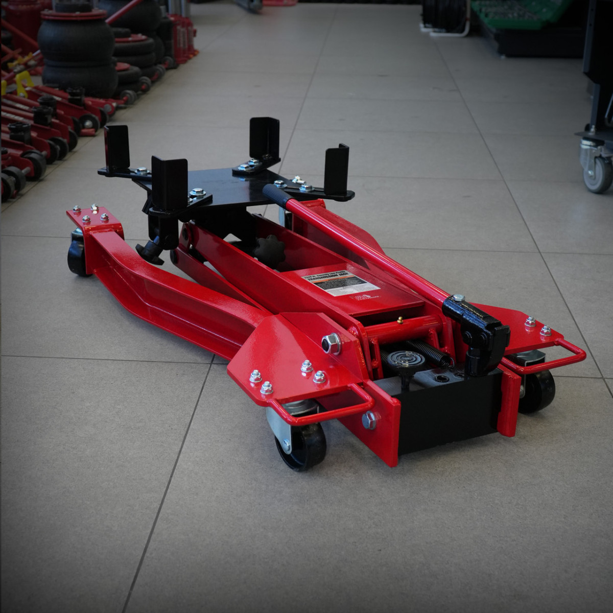 Подкатной трансмиссионный домкрат TORIN TRTL0702-1 - профессиональное оборудование для монтажа и демонтажа коробок передач, двигателей и других узлов автомобиля. Обеспечивает удобство и безопасность работы в автосервисе.