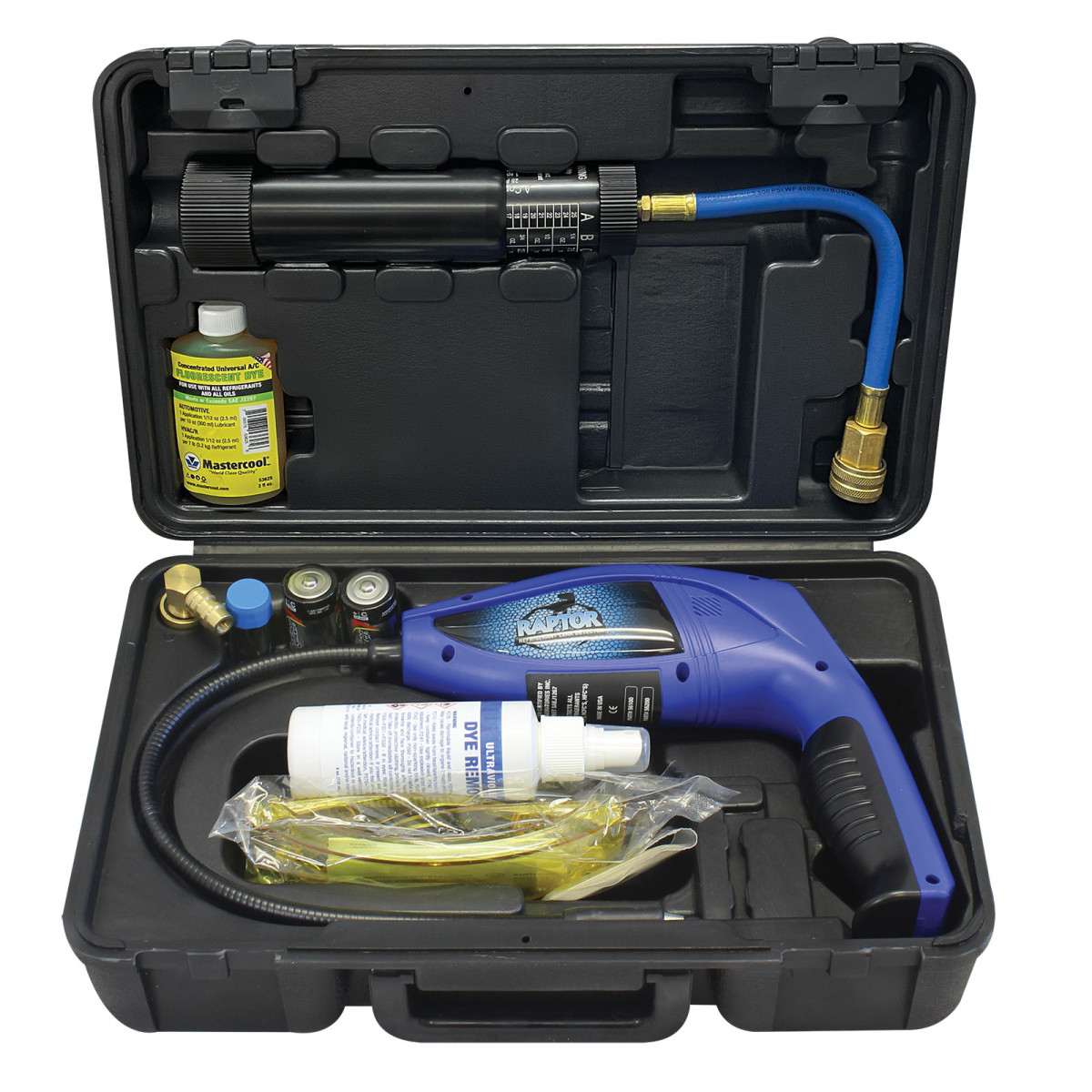 В набор входит электронный детектор утечек RAPTOR 56200, который эффективно обнаруживает галогенированные хладагенты, а также система впрыска УФ-красителя. Такой комбинированный метод позволяет сначала определить приблизительное место утечки электронным способом, а затем точно подтвердить его с помощью ультрафиолетового красителя.
