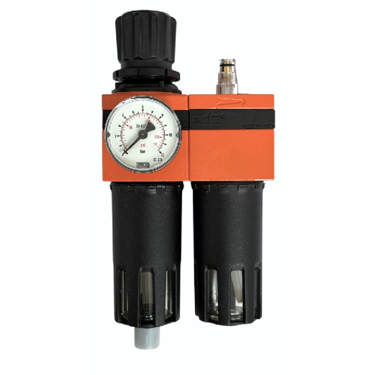 Фильтр эффективно удаляет влагу, масло и механические примеси со степенью фильтрации 20 мкм, что снижает износ пневмооборудования. Встроенный манометр позволяет контролировать рабочее давление в диапазоне 0-12 бар, а лубрикатор обеспечивает подачу масла для корректной работы пневматического инструмента.