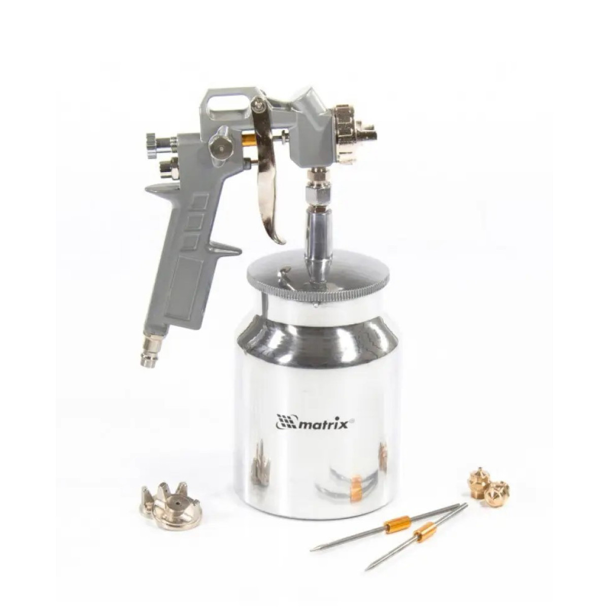 Краскопульт пневматический оснащён нижним металлическим бачком объёмом , что позволяет работать продолжительное время без частой дозаправки. Благодаря трём сменным соплам () инструмент подходит для различных задач - от окраски больших поверхностей до точного декоративного нанесения. Модель работает по технологии , обеспечивая ровный факел и качественное покрытие. Удобная эргономичная рукоятка снижает усталость при длительной работе. Краскопульт изготовлен из прочных материалов, что гарантирует долговечность даже при интенсивной эксплуатации.