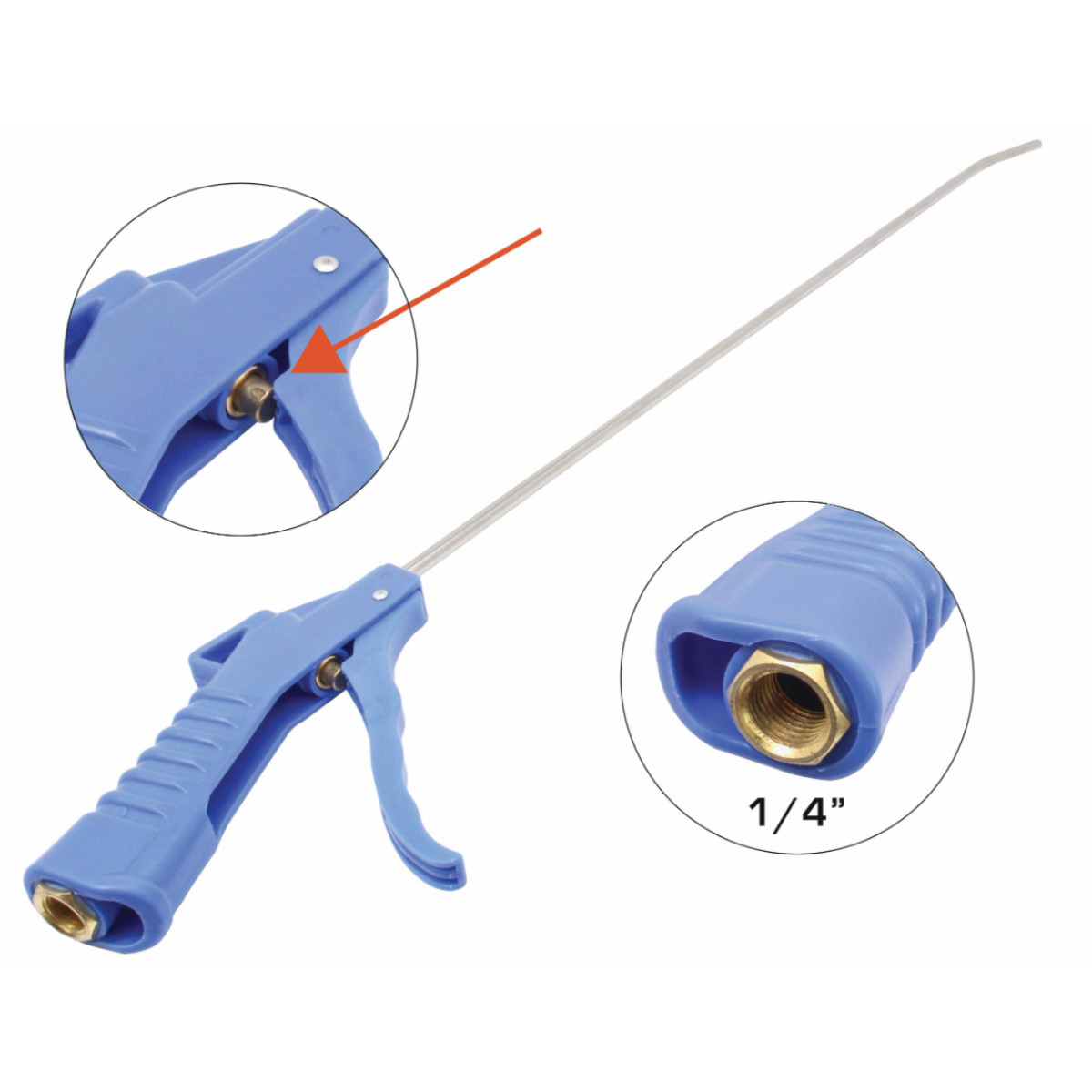 Пистолет продувочный SATRA S-BG20N используется для подачи сжатого воздуха. Предназначен для очистки поверхностей, деталей и труднодоступных мест от пыли, стружки, грязи и других загрязнений. Удлинённый носик (508 мм) обеспечивает лёгкий доступ в глубокие зоны, куда обычный инструмент не достаёт.