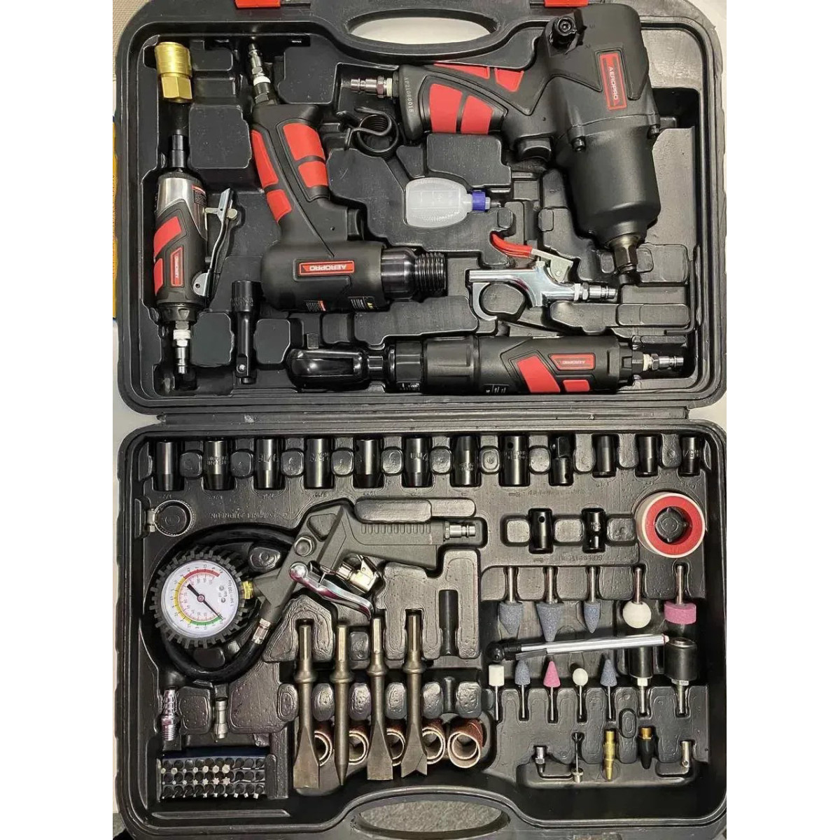 Все элементы удобно размещены в прочном пластиковом кейсе для хранения и транспортировки. - это универсальный комплект профессионального оборудования для автосервисов, шиномонтажных мастерских и гаражного применения. В набор входит : ударный гайковерт, ключ с трещоткой, пневматический молоток, зачистная машинка, продувочный пистолет, пистолет для подкачки колес, а также широкий ассортимент головок, бит, абразивов и аксессуаров.