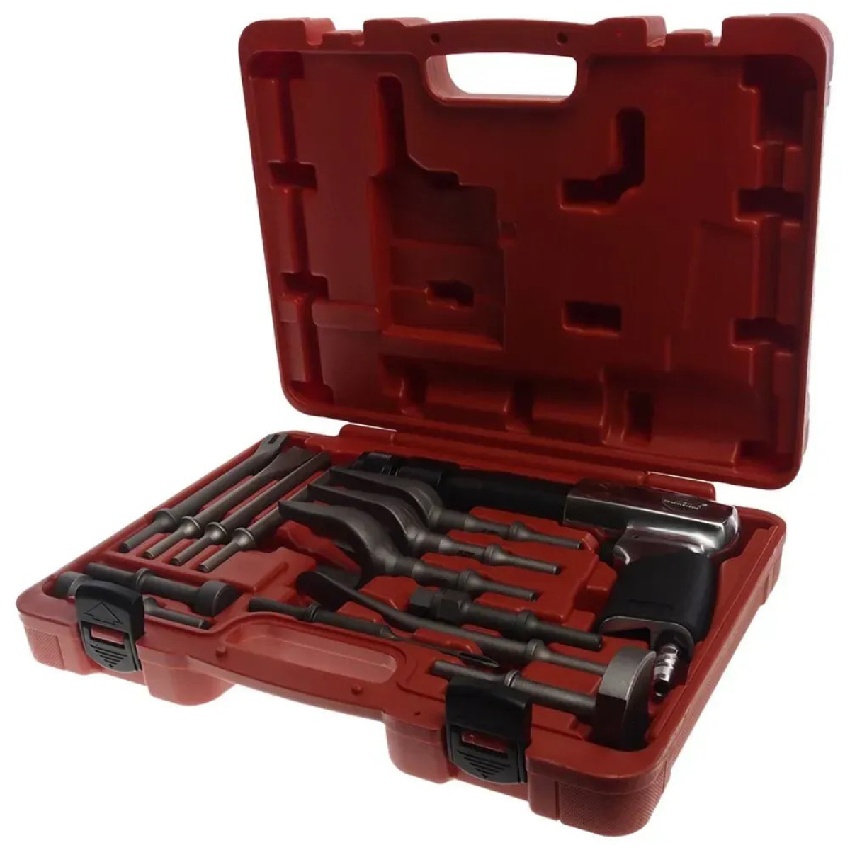 Пневматический молоток с набором на предназначен для ремонтных и демонтажных работ. Инструмент работает от сжатого воздуха, подаваемого компрессором, обеспечивает при относительно малом весе. Модель относится к , подтверждена сертификатом . Благодаря широкому набору насадок высокого качества можно выполнять различные задачи: демонтаж узлов, крепежей, работу с кузовными деталями и т.д. Инструмент проходит , которая защищает его от царапин, повреждений и коррозии. Все элементы набора удобно размещены в для хранения и транспортировки.