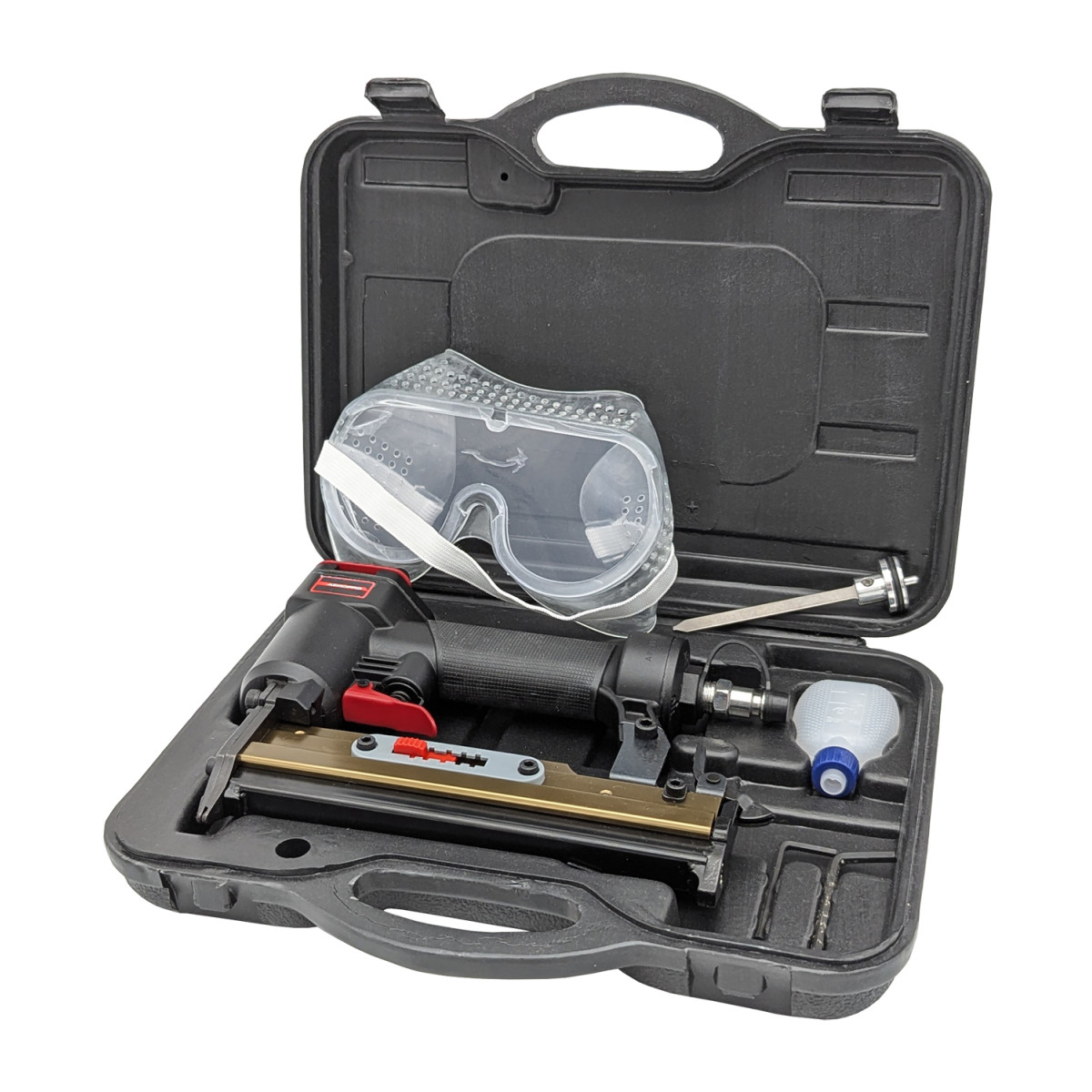 Пневматический степлер предназначен для точных мебельных и рамочных работ. Инструмент работает со шпильками длиной (типоразмер ) и обеспечивает надёжное крепление даже на деликатных поверхностях. Благодаря компактным размерам и весу всего степлер удобен в использовании и подходит как для профессиональных мастерских, так и для бытового применения. Корпус выполнен из прочных материалов, а прорезиненная рукоятка делает работу максимально комфортной. В комплект входят запасной боёк и аксессуары для обслуживания.