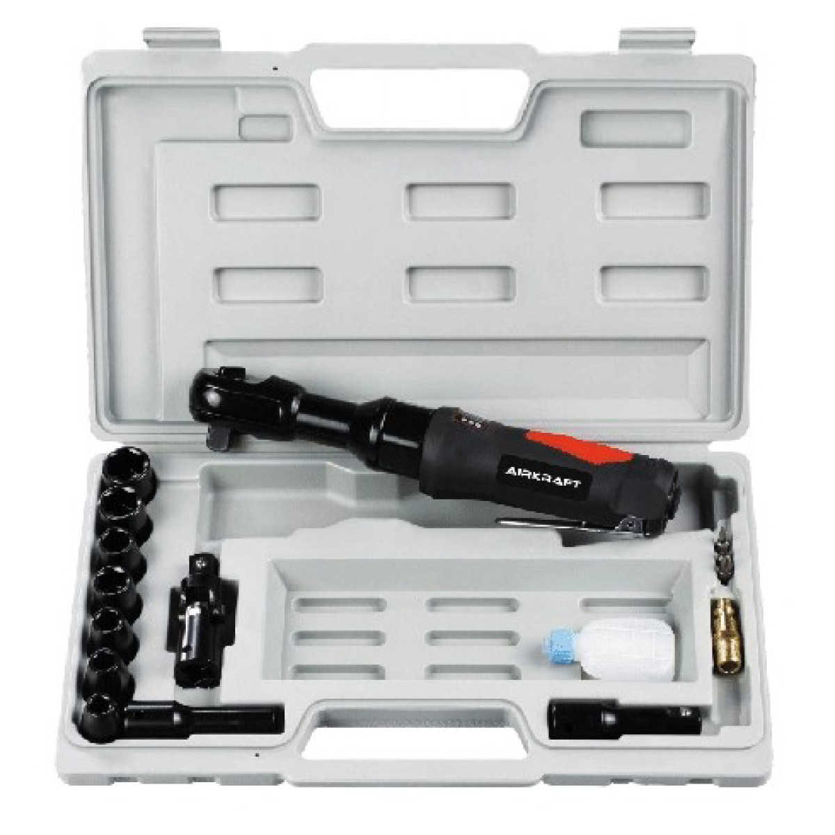 Пневматическая трещотка с набором инструментов предназначена для работы с небольшими крепежами в местах с ограниченным доступом. Это надёжный и удобный инструмент, способный передавать крутящий момент до 68 Нм и развивать скорость 160 об/мин. Идеально подходит для замены или перемещения радиаторов, свечей зажигания, установки и ремонта кондиционеров и водяных насосов.