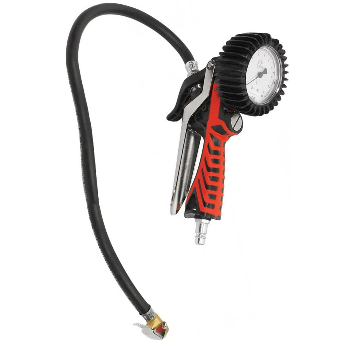 Профессиональный пневмопистолет от итальянского производителя , предназначенный для точного контроля и накачки шин. Оснащён большим манометром Ø80 мм в защитном корпусе и длинным гибким шлангом 1,5 м, что обеспечивает удобство работы даже с крупными колёсами. Высокая производительность (200 л/мин) делает модель идеальной для СТО, шиномонтажа и профессионального применения.