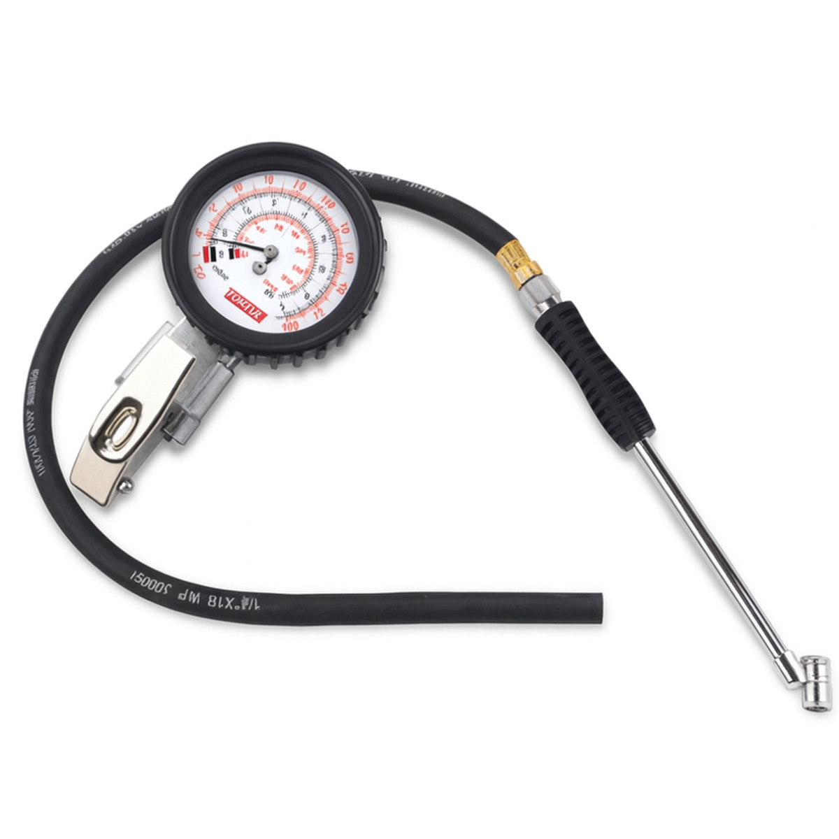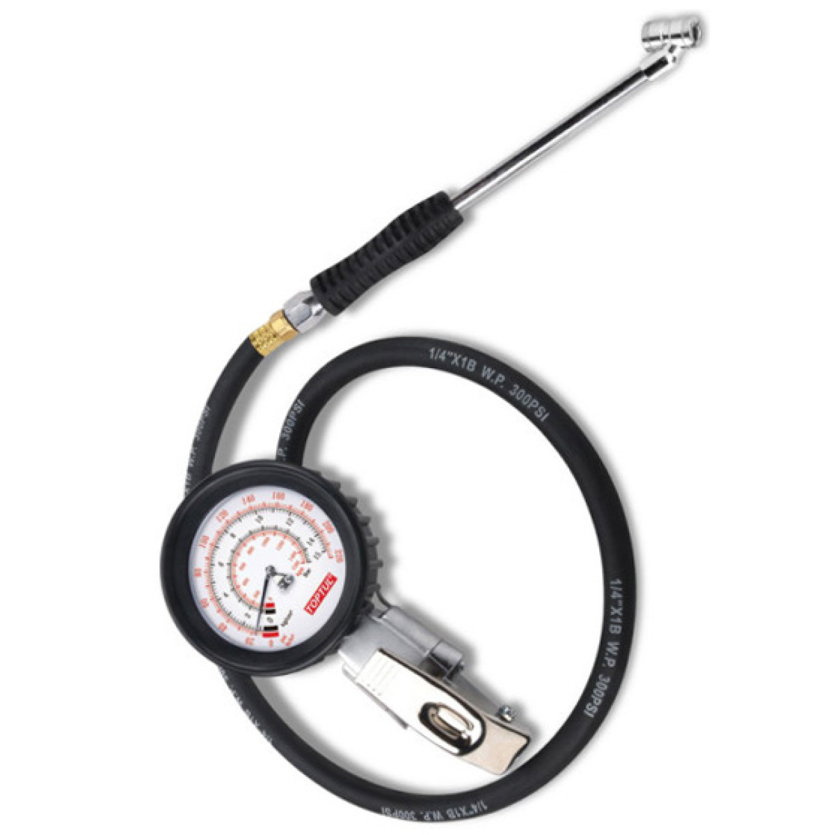 Профессиональный многофункциональный пневмопистолет для шин, выполняющий три функции: проверка давления, накачка и стравливание воздуха. Оснащён крупным манометром Ø90 мм в резиновом защитном корпусе и длинным шлангом с двойным зажимом, что делает его удобным для работы как с легковыми, так и с грузовыми автомобилями. Прочный алюминиевый корпус с латунными клапанами обеспечивает надёжность и долгий срок службы.