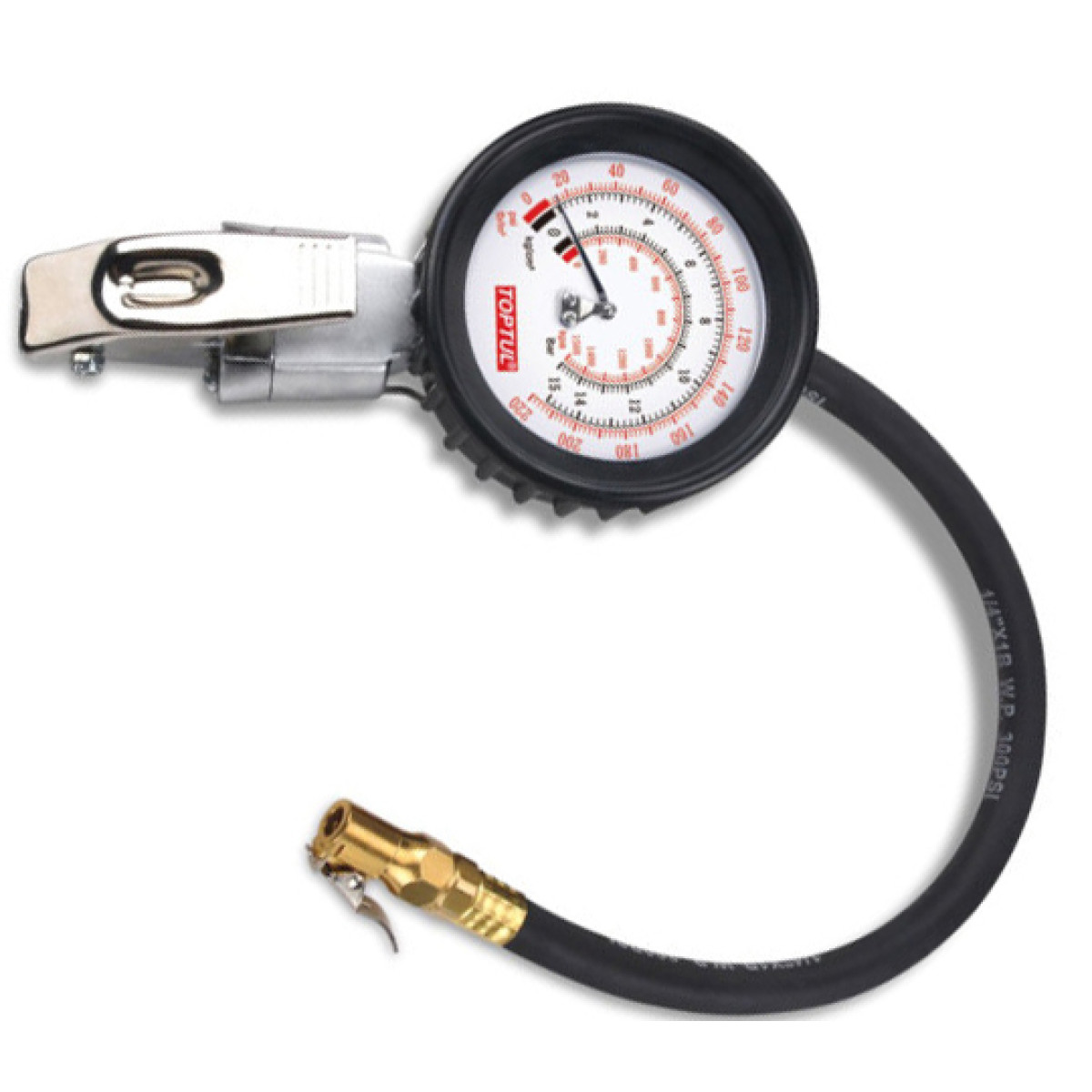 Профессиональный пневмопистолет для шин с многофункциональным манометром, выполняющий три задачи: проверка давления, накачка и стравливание воздуха. Оснащён крупным манометром диаметром 90 мм с резиновой защитой, гибким 50-сантиметровым шлангом высокого давления и эргономичным алюминиевым корпусом с латунными клапанами. Подходит для легковых и грузовых автомобилей, оптимален для СТО и шиномонтажных мастерских.