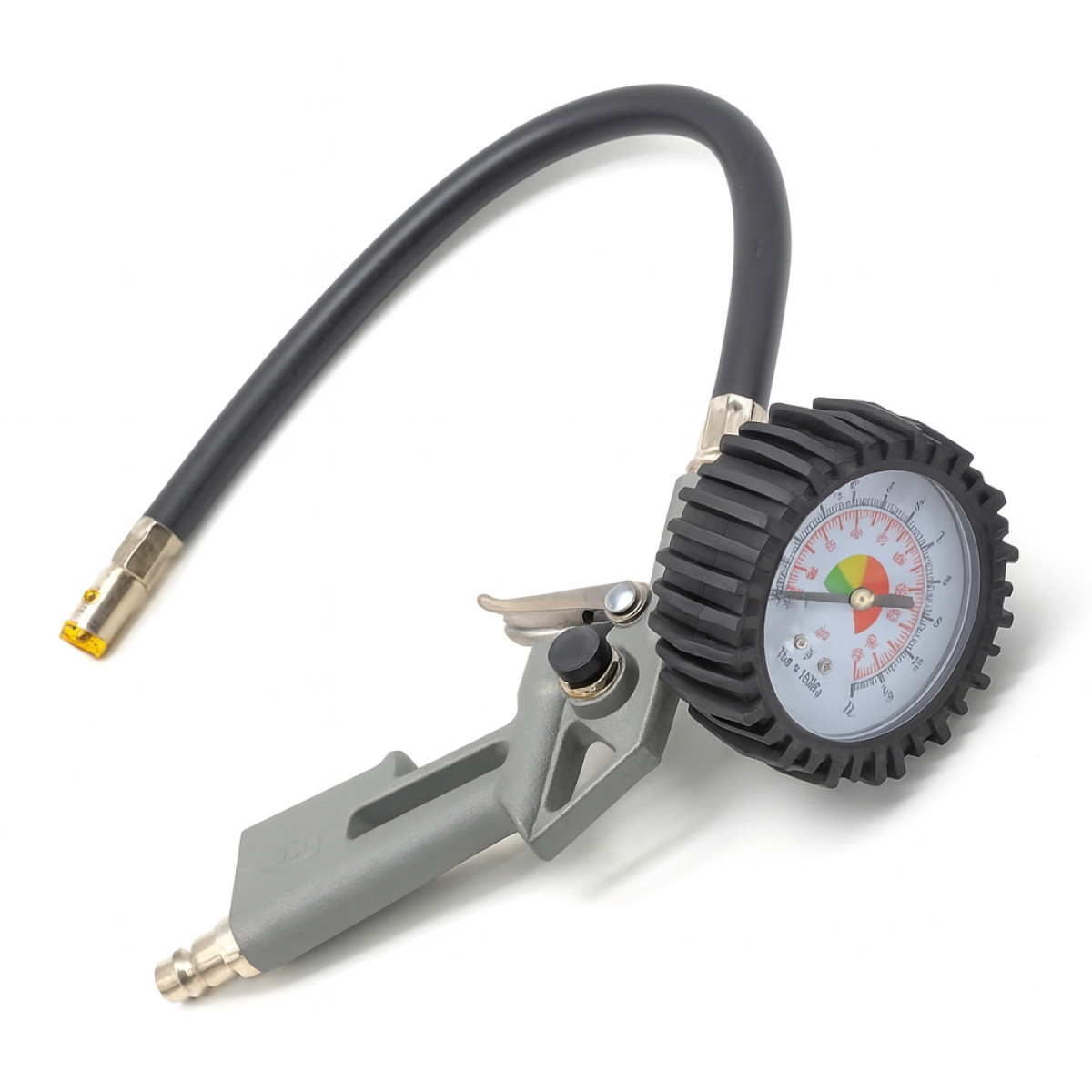 Пневмопистолет предназначен для подкачки, контроля и стравливания давления в шинах автомобиля. Оснащён манометром Ø 62 мм с ударопрочным корпусом, имеет стальной корпус и удобную металлическую ручку.