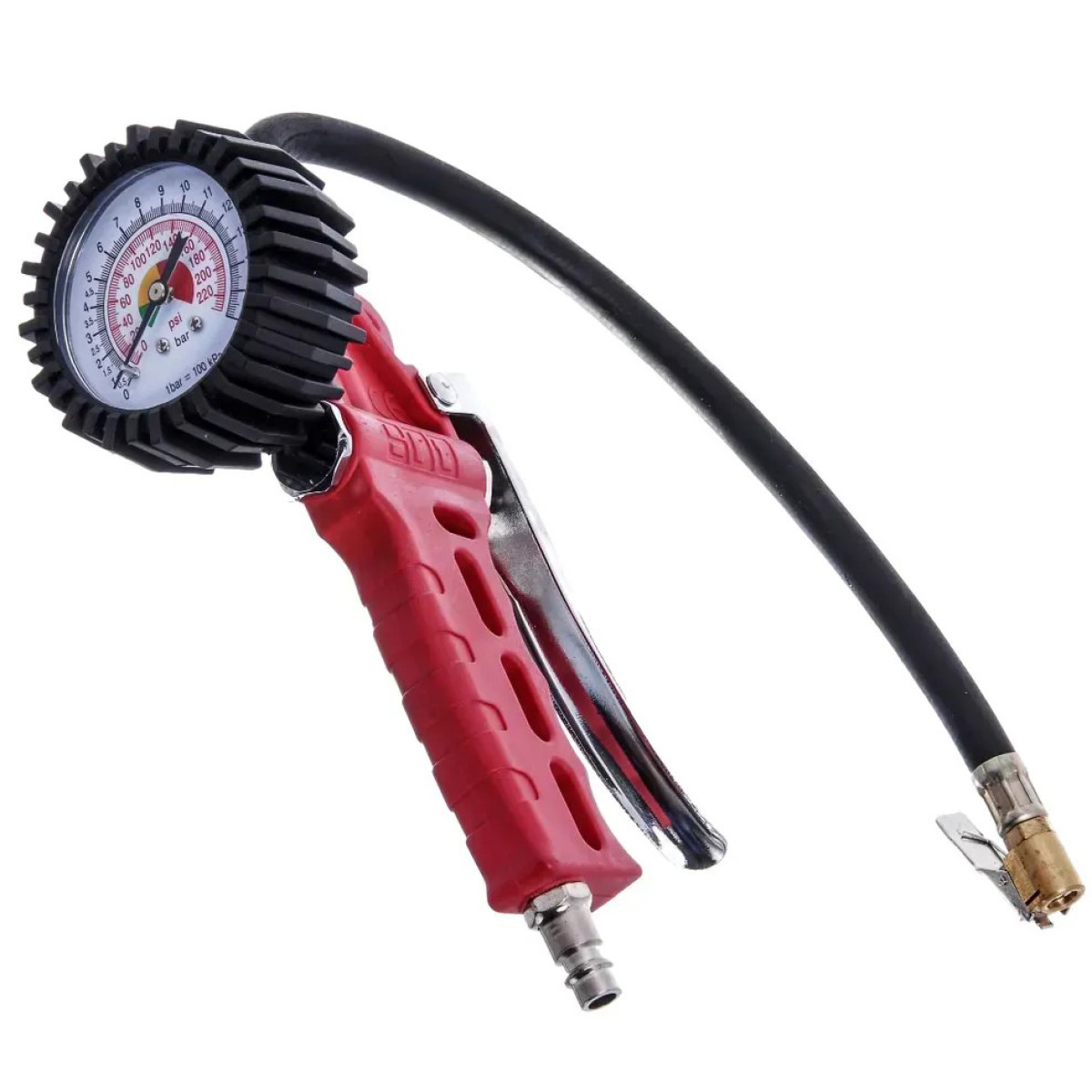 Пневмопистолет - надёжный инструмент для быстрого и удобного накачивания шин и камер. Манометр с чёткой шкалой в защитном резиновом кожухе позволяет контролировать давление в диапазоне 0–12 бар. Лёгкий и компактный корпус с удобной рукояткой обеспечивает комфортную эксплуатацию, а прочная конструкция гарантирует долгий срок службы. Оснащён гибким 50-см шлангом высокого давления с зажимом для надёжного подключения. Отлично подходит для СТО, шиномонтажей и личного применения.