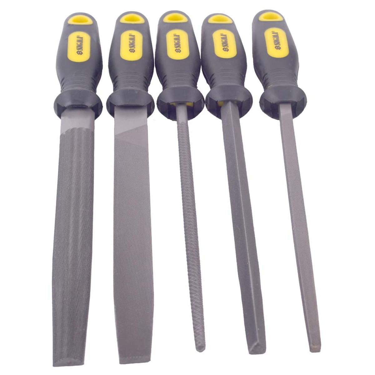 В комплект входят 5 напильников основных форм: плоский, треугольный, полукруглый, круглый и квадратный, что позволяет выполнять широкий спектр задач - от выравнивания поверхностей до обработки отверстий и углов.