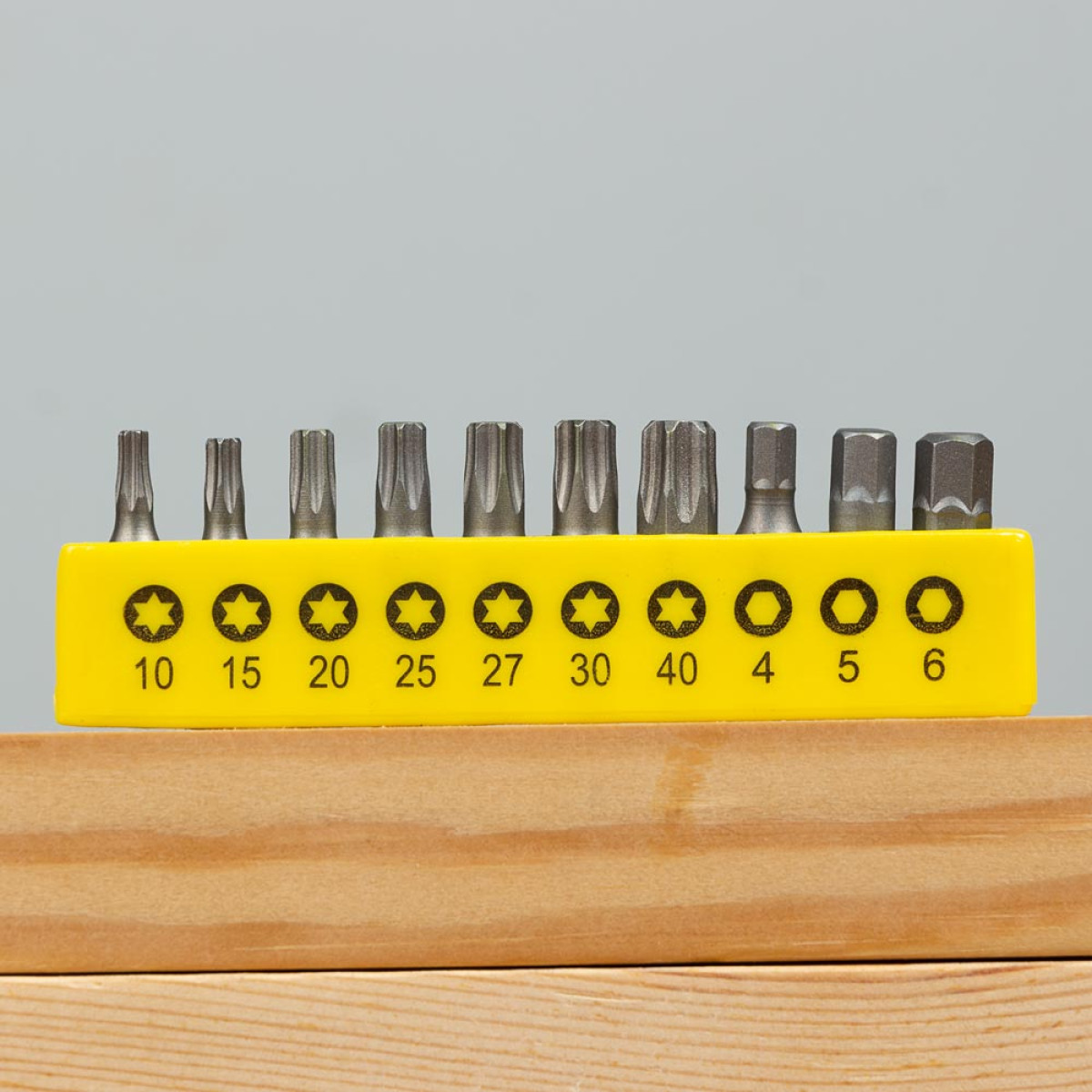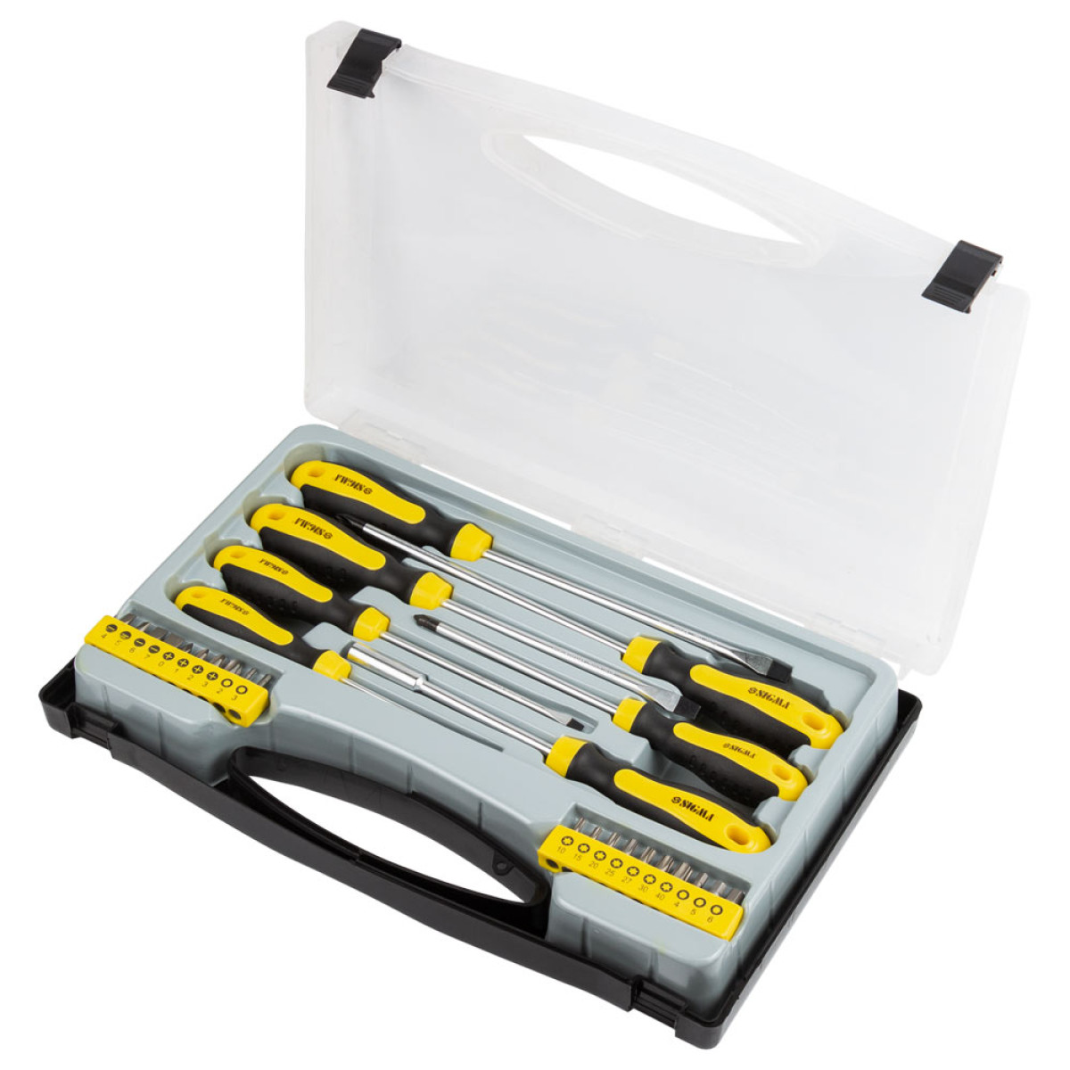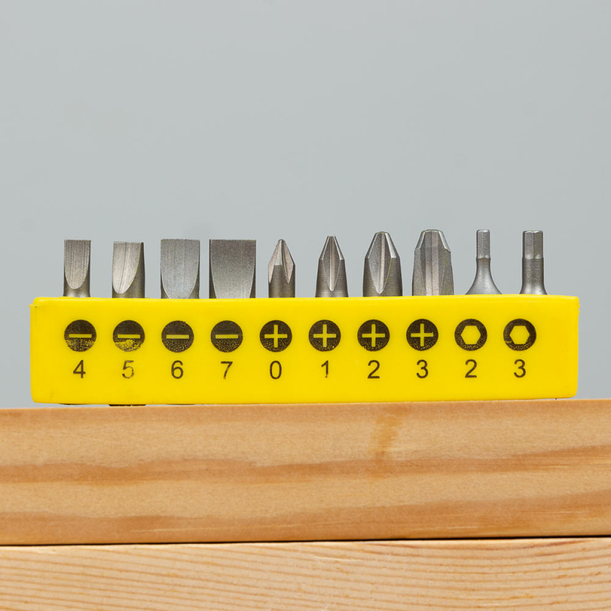 Практичный универсальный набор для бытового и профессионального применения. Жала отверток и биты изготовлены из хром-ванадиевой стали (CrV) с термообработкой, что обеспечивает высокую прочность, износостойкость и длительный срок службы. Магнитные наконечники упрощают работу с крепежом и повышают точность.