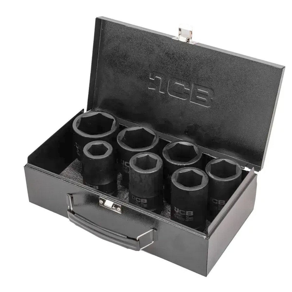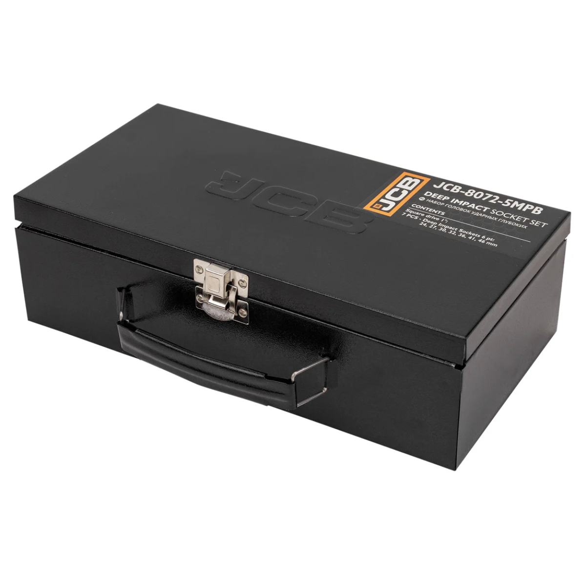 набор ударных головок 1 дюйм, JCB-8072-5MPB, JCB Tools, глубокие головки Cr-Mo, ударные головки в кейсе, набор головок 24–46 мм, набор для СТО, профессиональный набор головок, металлический кейс, ударный инструмент JCB, головки для гайковерта