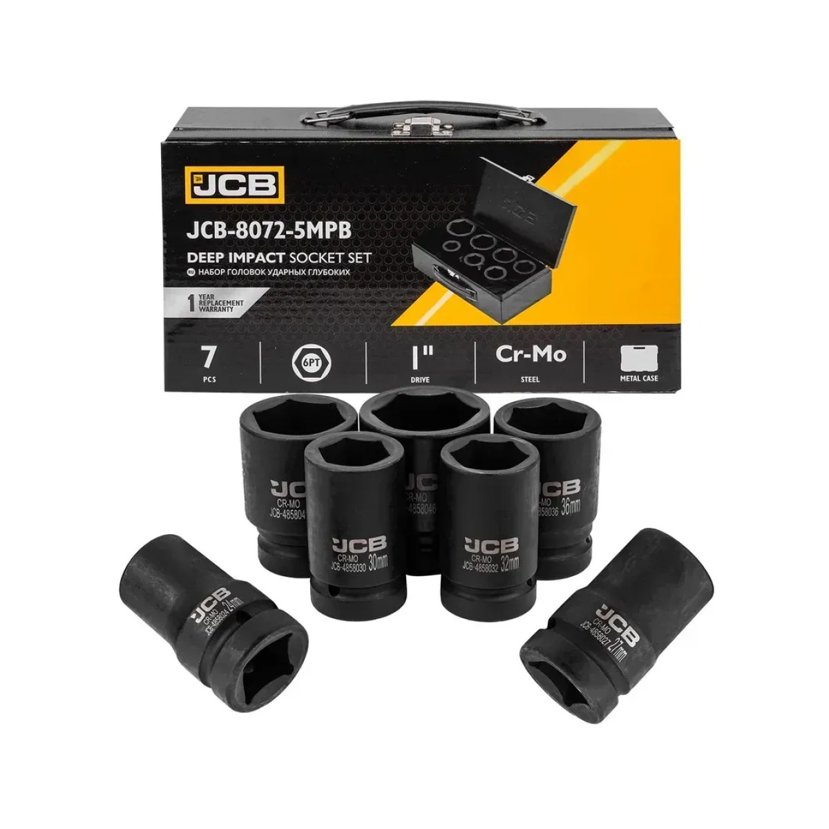 Набор головок ударных глубоких в металлическом кейсе 7 ед. 1'' (6-гр.) (24-46 мм) JCB Tools JCB-8072-5MPB - 65103