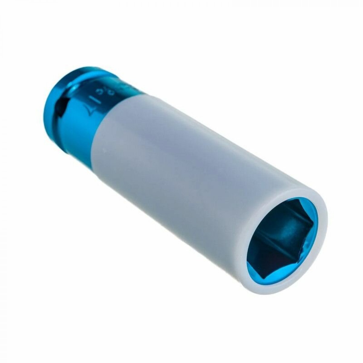 Благодаря глубине 85 мм головка позволяет работать с гайками, расположенными в труднодоступных местах. Защитная вставка бирюзового цвета предохраняет поверхность колесных дисков или других элементов от повреждений при работе.