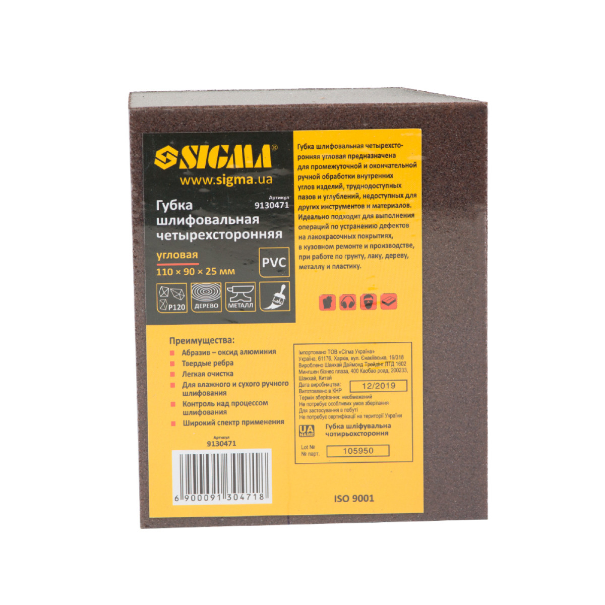 Губка шлифовальная четырехсторонняя угловая 110×90×25 мм P120 SIGMA (9130471) - 9130471