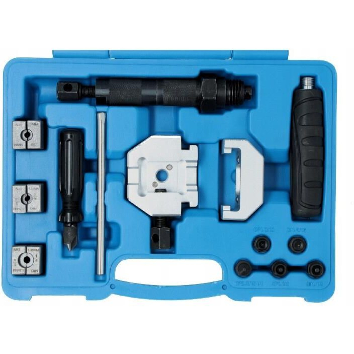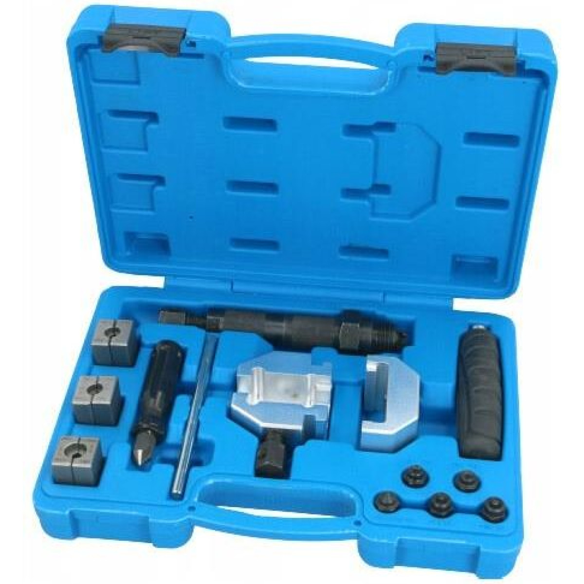 Гидравлический механизм обеспечивает равномерное усилие и точную геометрию развальцованного края, что гарантирует герметичность соединения. Набор широко применяется при ремонте и установке тормозных магистралей автомобилей, а также при монтаже систем кондиционирования и отопления.