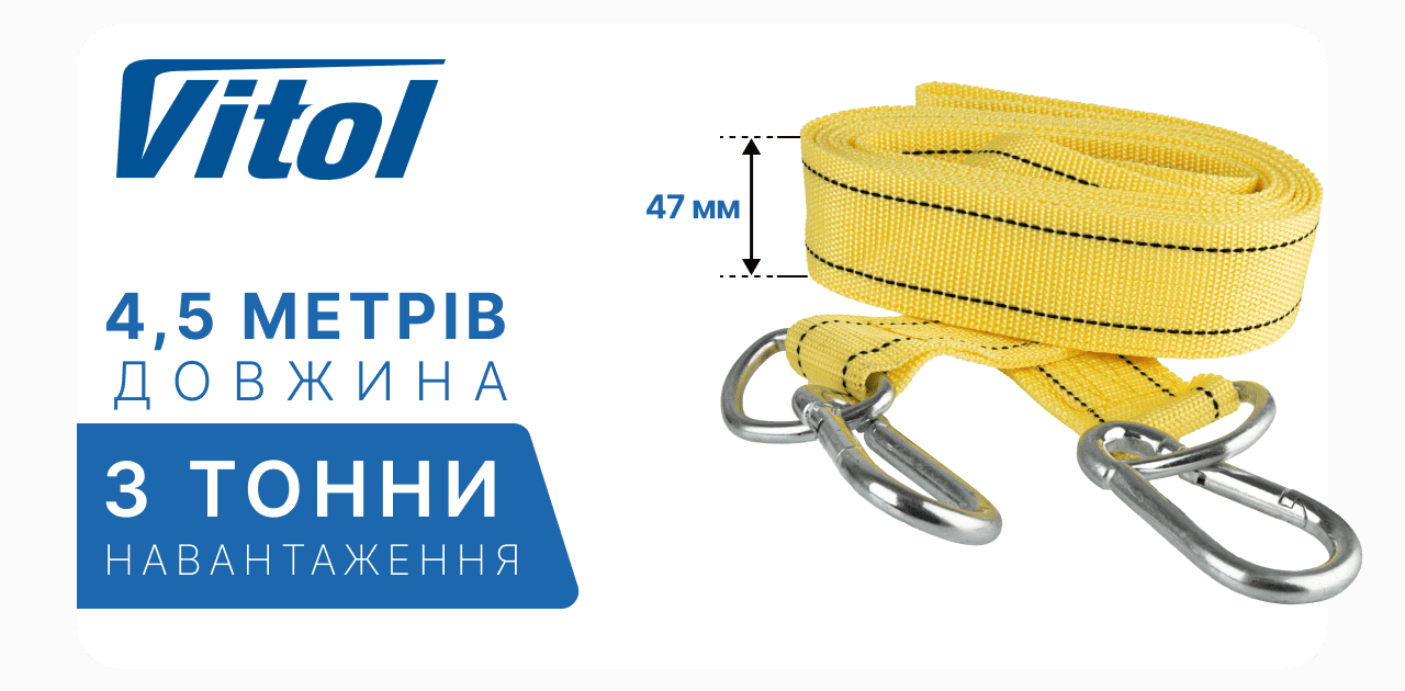 Трос буксирувальний з крабінами 3тонни, стрічка 47мм, довжина 4,5м VITOL (ТР-202-3-2) - ТР-202-3-2