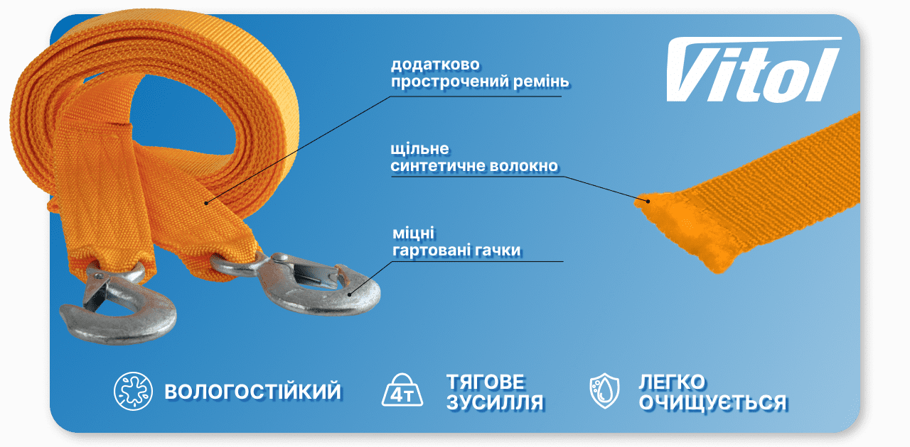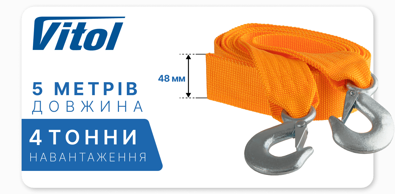 Трос буксирувальний з гаками 4тонни, стрічка 48мм, довжина 5м VITOL (ТР-250-4-1) - ТР-250-4-1