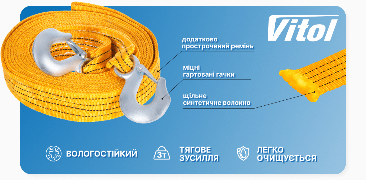 - Стрічкові троси для буксирування - це оптимальний варіант, займають небагато місця і яскраво пофарбовані, що підвищує помітність на дорозі.