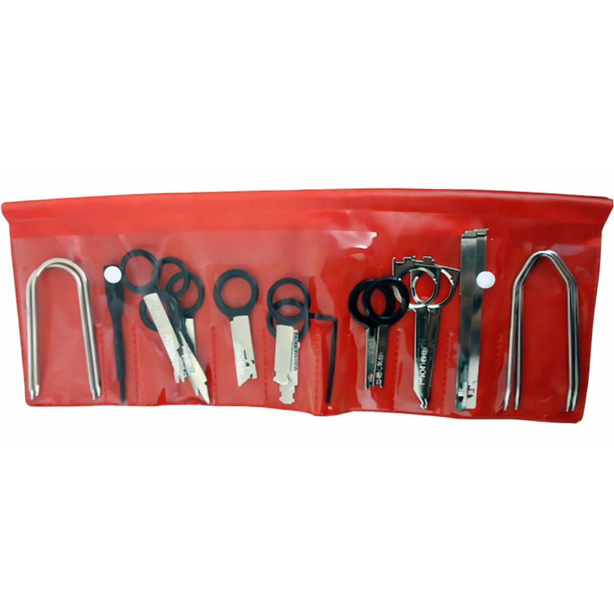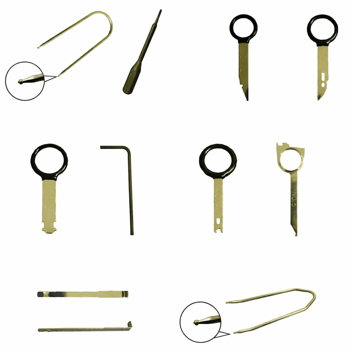Комплект для зняття автомагнітол - універсальний набір для штатних автомагнітол без пошкодження панелі або пристрою. У комплекті , що дозволяє працювати з широким спектром фіксаторів і конструкцій у популярних марках авто: , , , , , . Інструменти виготовлені з і мають для кращого захисту від подряпин і корозії. Набір належить до класу, а якість підтверджено .