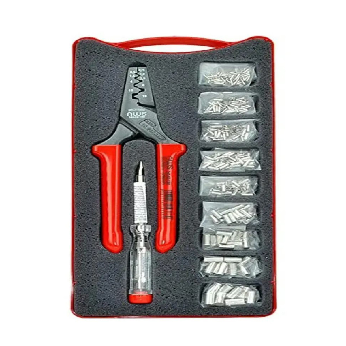 постачаються у пластиковому футлярі з прозорою кришкою. Набір укомплектований кліщами для обтиску довжиною та приблизно неізольованих кабельних затискачів (муфт) у асортименті для перерізів . Формат набору зручний для зберігання й транспортування, а індикатор допомагає під час виконання з’єднань. Габарити футляра - , вага - .