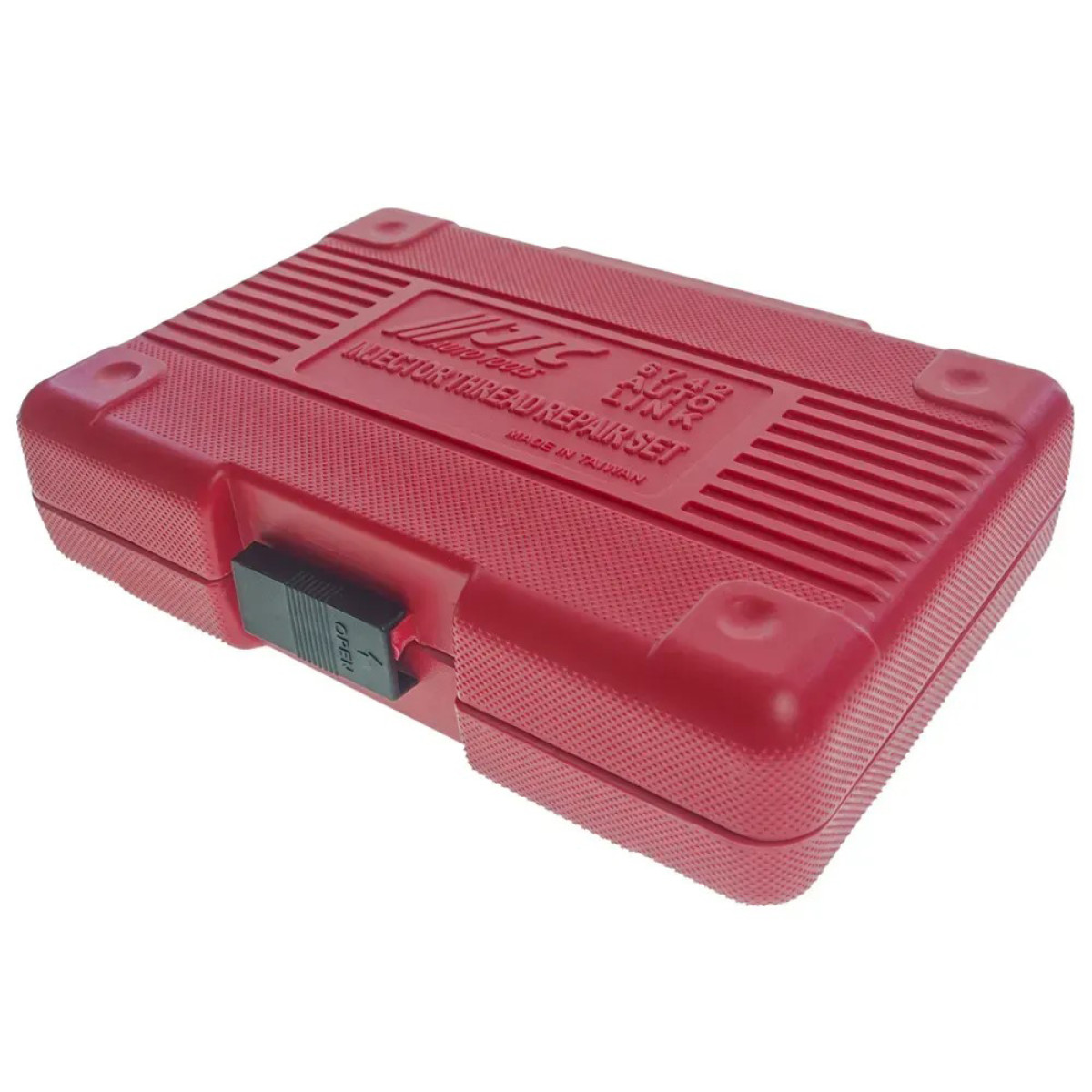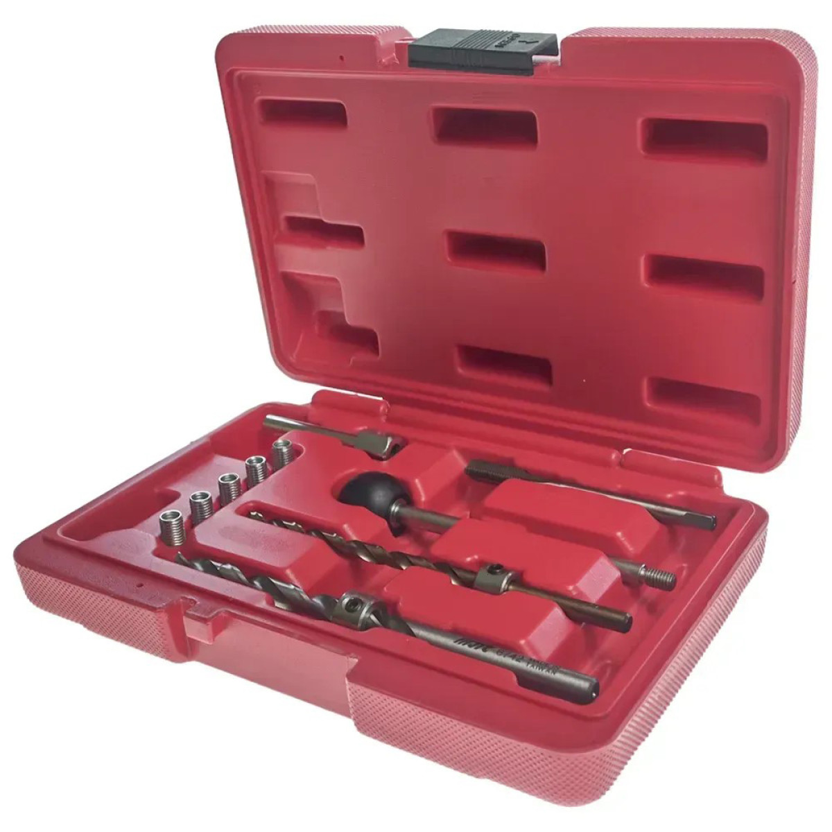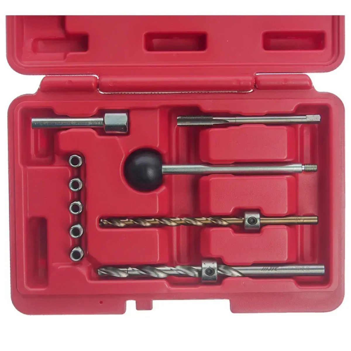 Набір призначений для швидкого та точного відновлення різьблення у блоці циліндрів після поломки болтів . Дозволяє виконати ремонт без необхідності знімати головку блоку циліндрів (ГБЦ), що значно економить час і кошти.Відновлює різьбу до розміру , забезпечуючи надійне з’єднання. Інструмент проходить , що захищає його поверхню від подряпин, корозії та пошкоджень. Виготовлений із , що відповідає професійному стандарту .