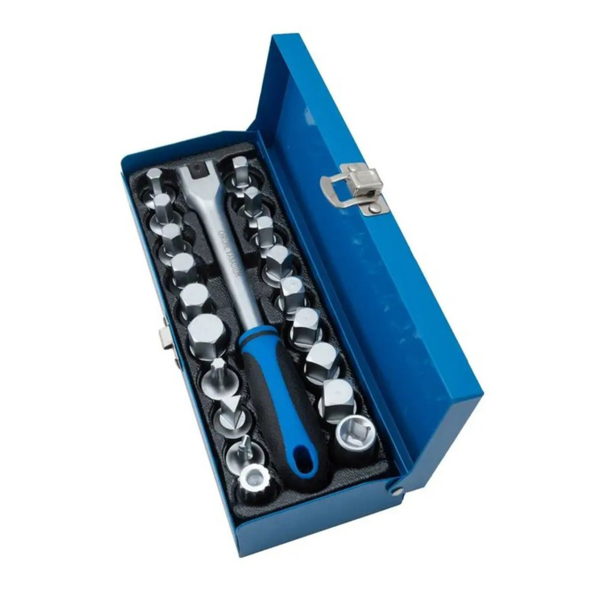 Набір для пробок призначений для і під час заміни масла в двигуні, КПП, диференціалах і мостах. Комплект має посадковий квадрат та включає насадок найпоширеніших профілів, а також спеціальні елементи для роботи з пластиковими пробками VAG. , , , .