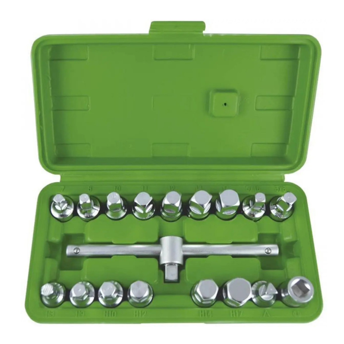 Набір насадок під пробки для спуску масла призначений для пробок у двигуні, КПП, мостах і диференціалах. Комплект містить , що дозволяє працювати з більшістю типів пробок без підбору окремих ключів. У наборі є вороток зі стрижнем довжиною , який забезпечує зручний важіль і контроль зусилля. , , , .