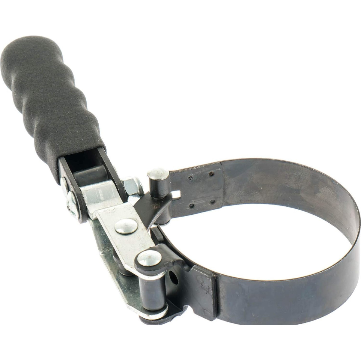 Знімач масляних фільтрів призначений для діаметром . Інструмент полегшує демонтаж прикипілих фільтрів завдяки пружній сталевій стрічці, яка щільно охоплює корпус і забезпечує . Поворотна головка допомагає швидко вирівнювати стрічку по фільтру, що підвищує зручність у роботі. Ергономічна нековзна ручка і загальна довжина дають комфортний важіль для щоденного використання в гаражі або на СТО.