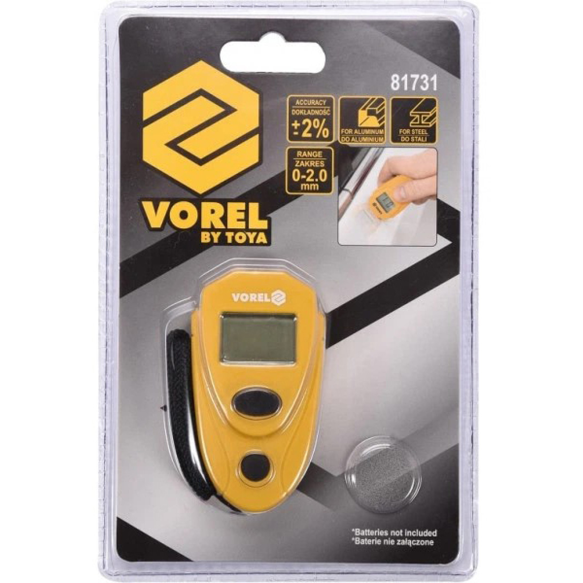 Товщиномір лакофарбового покриття VOREL 81731 призначений для вимірювання товщини лаку та фарби на металевих поверхнях. Прилад дозволяє швидко та точно визначити стан лакофарбового покриття, а також виявити деталі кузова, які піддавалися ремонту або багаторазовому фарбуванню. Завдяки діапазону вимірювання 0–2 мм та похибці ±2 %, товщиномір забезпечує достовірні результати вимірювань у побутових і професійних умовах. Результати вимірювання відображаються на РК-дисплеї, що забезпечує зручне та швидке зчитування показників. Компактні розміри та мала вага 25 г забезпечують високу мобільність та зручність використання, а пластиковий корпус робить прилад легким і простим в експлуатації. Товщиномір VOREL 81731 ідеально підходить для перевірки автомобілів, контролю якості фарбування та експрес-діагностики кузовних елементів.