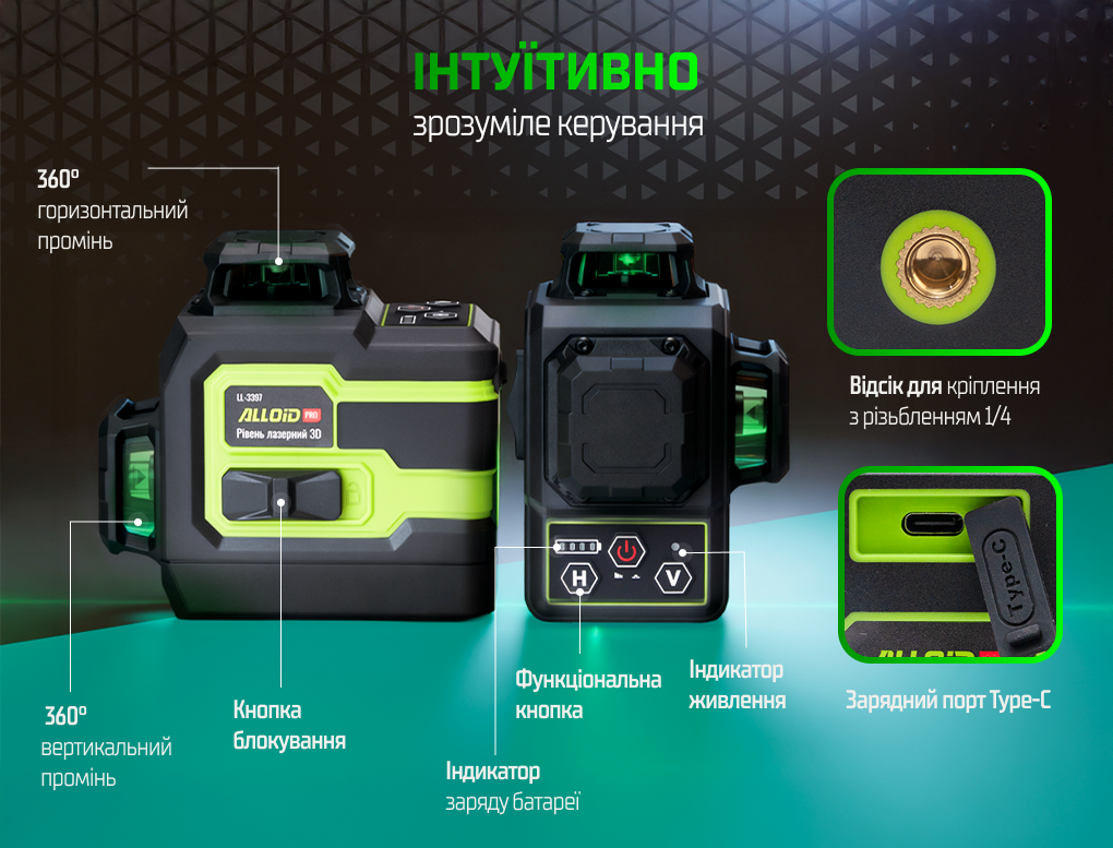 — професійний , створений для точного та швидкого формування горизонтальних, вертикальних і діагональних площин. Прилад проєктує , формуючи повну 3D-сітку для розмітки під час будівництва, монтажу або оздоблювальних робіт. Завдяки потужному зеленому лазеру та ергономічному корпусу, модель LL-3397K забезпечує високий рівень точності навіть у складних умовах освітлення.