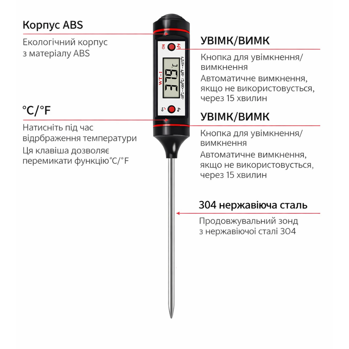 Металевий зонд з нержавіючої сталі дозволяє швидко вимірювати температуру продуктів під час приготування їжі - м'яса, стейків, барбекю, індички, напоїв або рідин. Великий LCD-дисплей забезпечує чітке відображення результатів вимірювання.