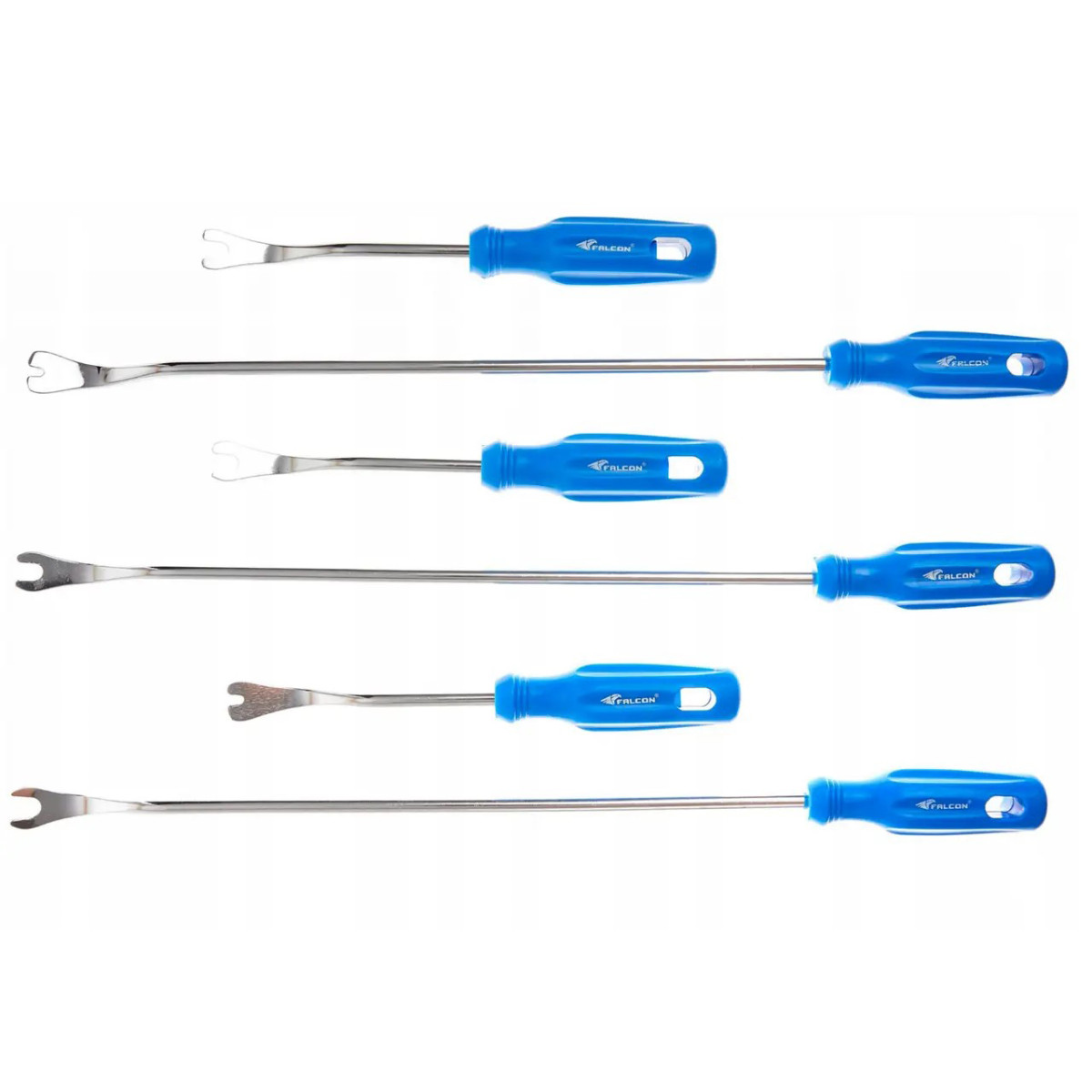 Набір знімачів кліпс обшивки FALCON F05010 призначений для швидкого та легкого розстібання затискачів обшивки автомобілябез пошкодження пластикових елементів. Інструменти підходять для роботи з кліпсами найпоширеніших розмірів 4, 8 і 10 мм, що робить набір універсальним для більшості автомобілів. Дві різні довжини інструментів дозволяють зручно працювати як у відкритих, так і у важкодоступних місцях, а ергономічна форма рукояток забезпечує точний контроль і комфорт під час роботи.