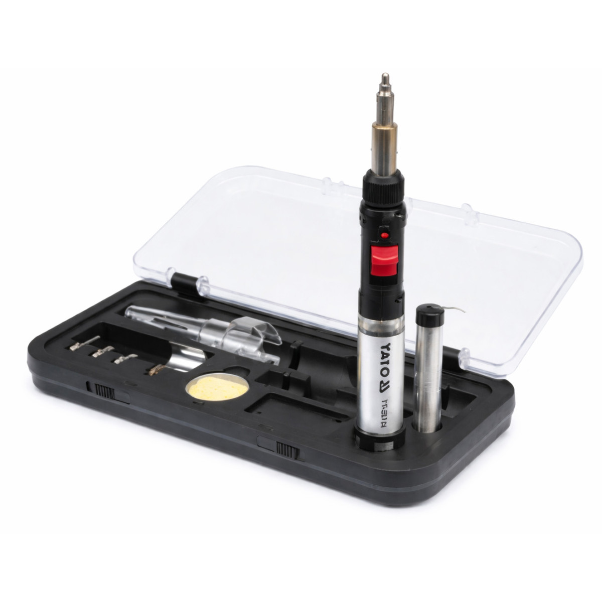 Газовий паяльник YATO YT-36706 є універсальним інструментом для пайки, нагріву та термообробки, що працює на бутановому або пропан-бутановому газі для запальничок. Пристрій поєднує три режими роботи в одному корпусі, що значно розширює сферу застосування. Інструмент забезпечує потужність від 30 до 125 Вт, що дозволяє виконувати точну пайку оловом, ефективну усадку термоусадкових матеріалів, пірографію, пайку мідних труб, послаблення заклинивших гвинтів, розморожування, термозварювання та склеювання, а також гнуття й термоформування матеріалів. Газовий паяльник оснащений п’єзоелектричним підпалом, підтримує температуру наконечника до 450 °C, температуру обдуву до 600 °C та температуру полум’я до 1300 °C.