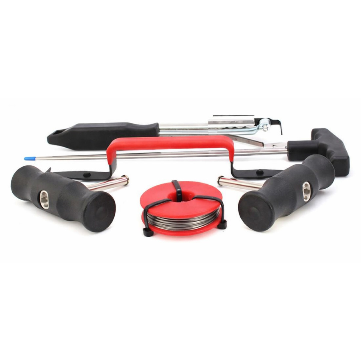 Набір для демонтажу автомобільного скла призначений для Комплект містить інструменти, необхідні для виконання повного циклу робіт зі зрізання клеєвого шару та відокремлення скла від кузова. Використання котушки з ріжучою струною та спеціальних тримачів дозволяє , , . Двосторонній різак і допоміжні інструменти забезпечують . Набір підходить для професійного використання на СТО та в автосервісах.