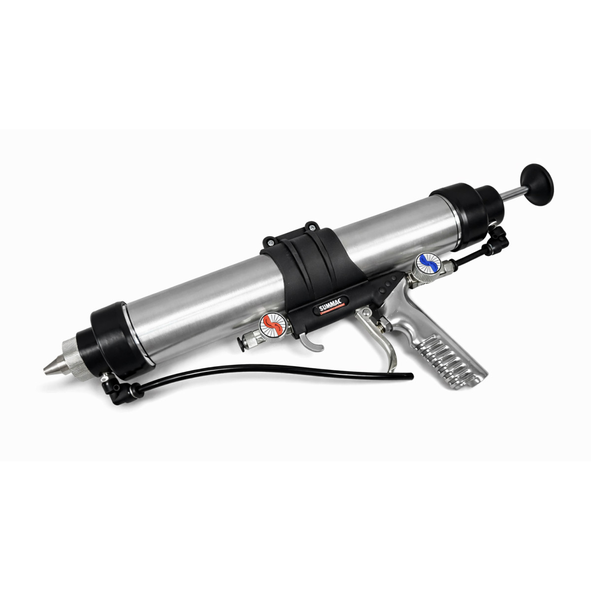 Пневмошприц для туб SUMAKE ST-66413 є багатофункціональним пневматичним інструментом 3 в 1 для видавлювання та розпилення силікону, клею й герметиків у тубах об’ємом 500 мл. Інструмент розроблений для професійного використання та широко застосовується під час заміни автомобільного скла, встановлення сантехніки, а також у будівельному й автомобільному ремонті. Оптимальна форма корпусу та розширені налаштування параметрів роботи забезпечують високу точність і контроль нанесення матеріалу. Ємність для туб стандартного розміру 500 мл виготовлена з безшовної алюмінієвої труби, що гарантує міцність, герметичність і довгий термін служби. Надійна різьбова фіксація всіх елементів повністю виключає ризик розгерметизації під час роботи. Пневмошприц належить до професійного класу, має сертифікат відповідності та міжнародний стандарт DIN EN ISO 9001:2000, що підтверджує стабільну якість і надійність. Інструмент ефективно використовується у СТО, майстернях і гаражах, забезпечуючи швидкий, рівномірний і акуратний результат.