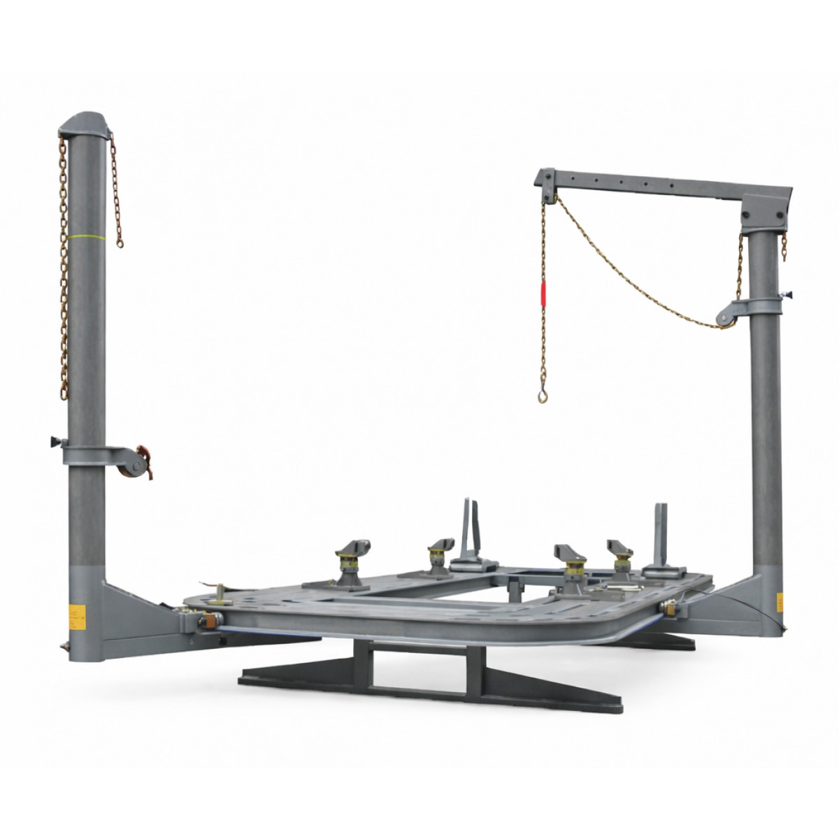 Платформний стапель SkyRack SR-923 призначений для правки геометрії кузова легкових автомобілів і позашляховиків, що мають відбортовку порогів. Для ремонту авто без відбортовки порогів застосовуються спеціальні адаптери для фіксації кузова на стенді. Потужна рама оригінальної напівкруглої конструкції витримує високі навантаження під час ремонту, а отвори по периметру дозволяють встановлювати силові пристрої під будь-якими кутами. Конструкція рами забезпечує доступ до днища автомобіля, що спрощує виконання робіт. Кожен силовий пристрій має вмонтований гідроциліндр, що працює від гідравлічного насоса. Силові пристрої переміщуються по периметру рами, швидко фіксуються притискним важелем і дають змогу працювати навіть у кутових зонах. Для заїзду автомобіля задня частина рами опускається підйомним пристроєм. Стійки кріплення фіксують авто за відбортовку порогів, а комплект оснащення допомагає виконувати ремонт швидко, точно та якісно.