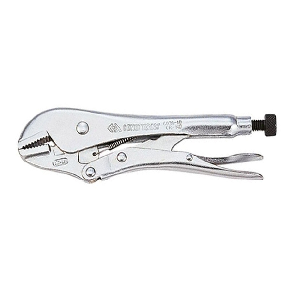 Затискач з фіксатором з прямими губками KING TONY 6031-07R призначений для надійної фіксації металевих деталей під час монтажних, слюсарних і зварювальних робіт. Забезпечує стабільне утримання заготовок, дозволяє виконувати свердління, різання та зварювання без зміщення деталі, звільняє руки майстра під час виконання робіт. Конструкція інструмента нагадує ручні тиски та поєднує в собі дві рукоятки, захватні губки з насічками та механізм фіксації. Регулювальний гвинт на верхній рукоятці дозволяє точно підлаштувати розкриття губок під розмір деталі, а важіль швидкого скидання забезпечує оперативне розтискання після завершення роботи. Інструмент виготовлений з легованої сталі з додаванням хрому та молібдену та має хромоване покриття, що підвищує стійкість до корозії та зношування. Загальна довжина затискача становить 178 мм, максимальний розмір захоплюваної деталі - 33 мм.
