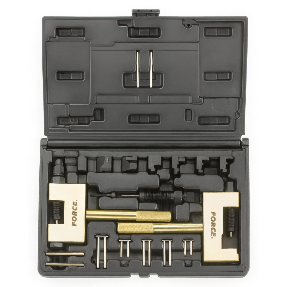FORCE – професійний набір інструментів для обслуговування газорозподільного механізму, що включає 22 предмети. Комплект призначений для розділення та встановлення розподільчого ланцюга на дизельних двигунах Mercedes-Benz, а також деяких моделях Chrysler та Jeep. Інструменти забезпечують швидке та зручне розбирання, підходять для роботи з односторонніми та двосторонніми ланцюгами.