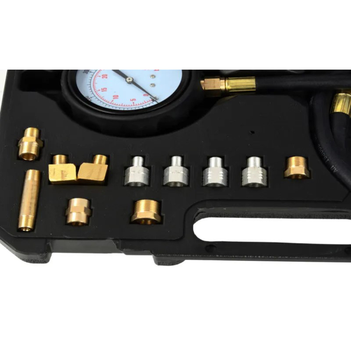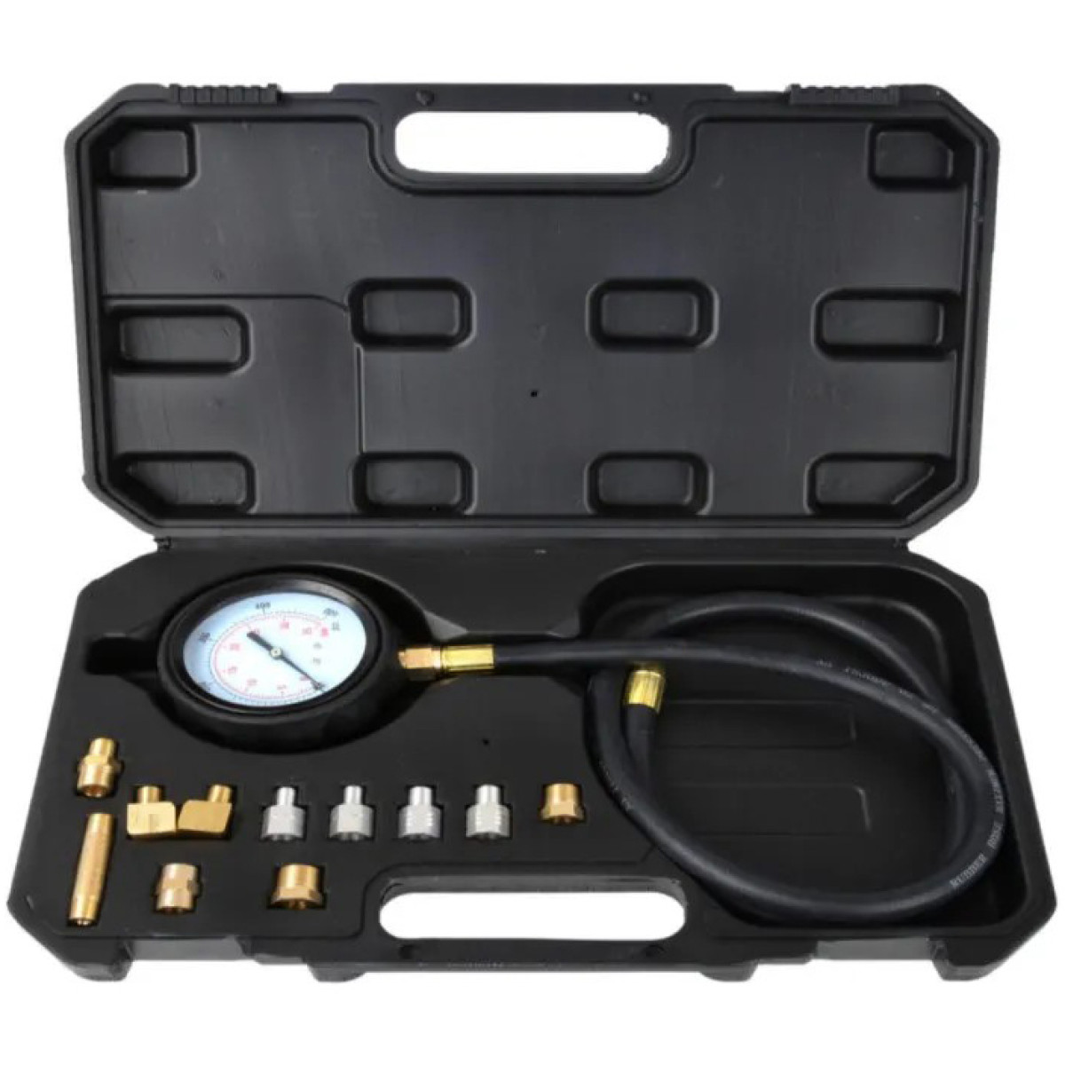Тестер тиску масла універсальний з набором перехідників призначений для діагностики системи змащення двигуна та контролю тиску масла. Інструмент дозволяє точно визначити технічний стан двигуна, підходить для легкових і вантажних автомобілів. Оснащений манометром з подвійною шкалою та комплектом адаптерів для широкого застосування.