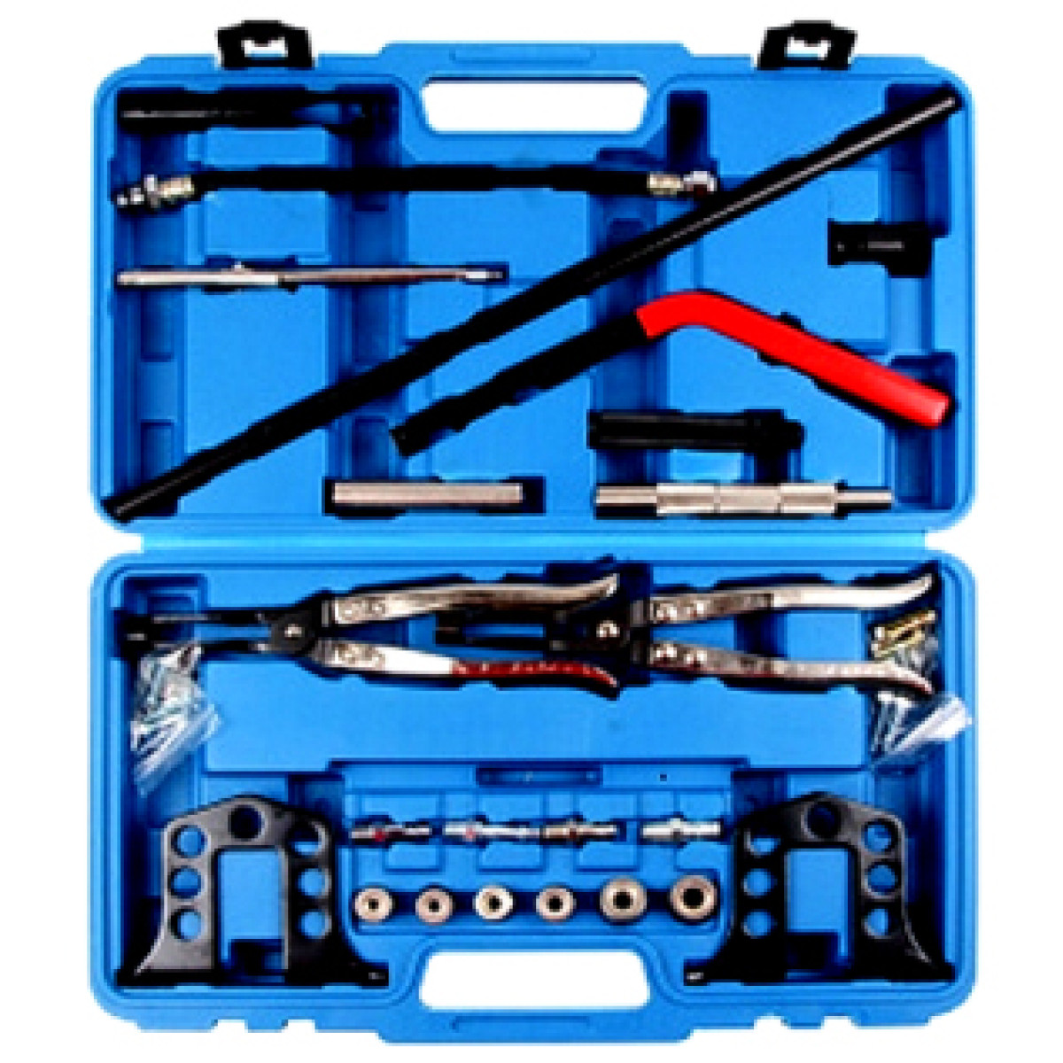Комплект для розсухарювання клапанів та встановлення сальників призначений для обслуговування клапанного механізму без необхідності зняття головки блоку циліндрів. Інструмент застосовується для двигунів типу OHV та OHC і дозволяє виконувати демонтаж клапанів, заміну маслознімних ковпачків та інші роботи швидко й ефективно. Комплект оснащений різноманітними пристроями та адаптерами, що забезпечують універсальність і зручність у роботі як для професійних майстерень, так і для індивідуального використання.