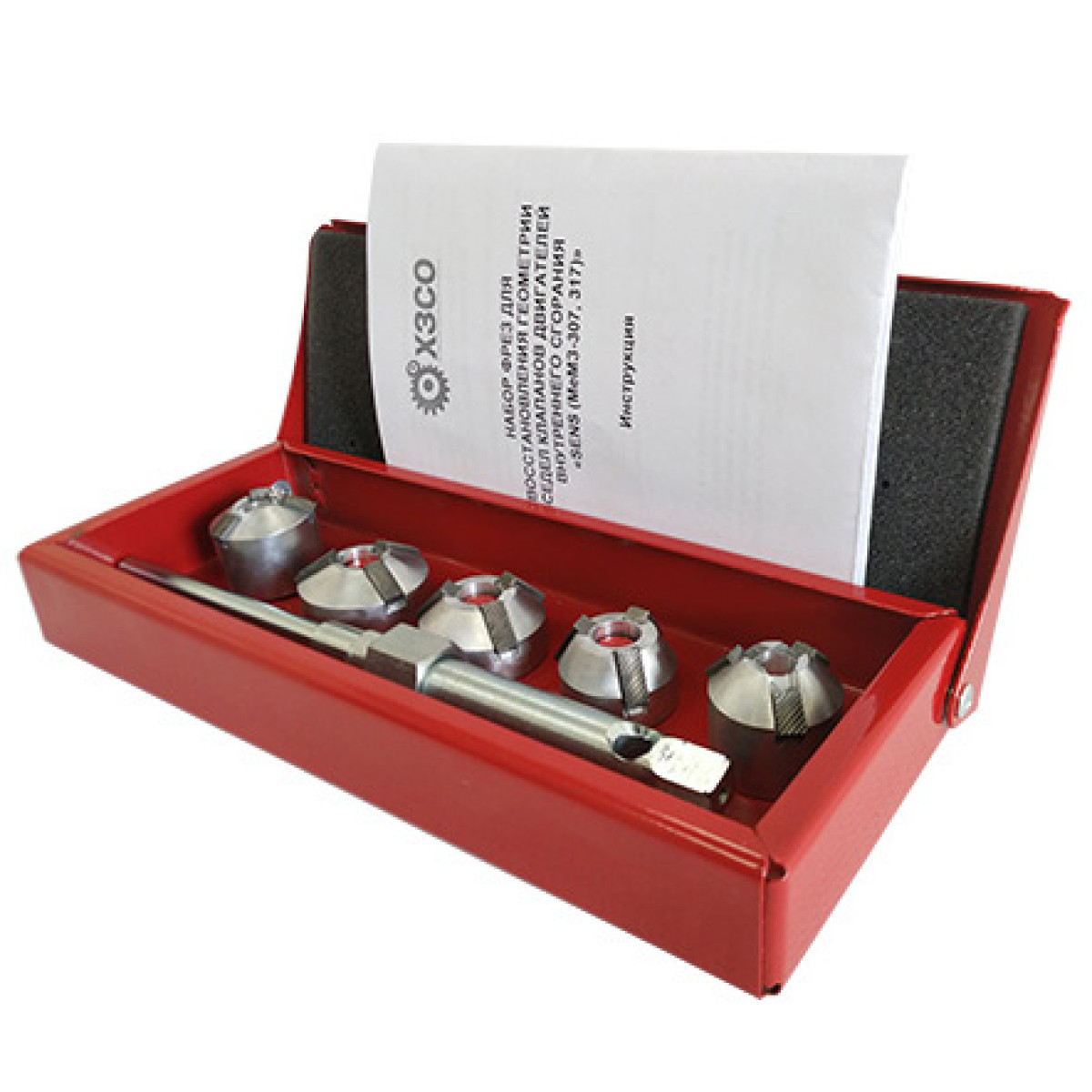 Набір фрез для відновлення сідел клапанів ДВЗ DAEWOO Sens (МеМЗ 307, 317) - призначений для відновлення геометрії сідел клапанів двигунів внутрішнього згоряння автомобілів ЗАЗ. Фрези (шарошки, зенкера) мають ріжучі ножі з фіксованим положенням, тобто нерегульовані відносно корпусу. Конструкція і розміри фрез дозволяють обробляти сідла клапанів, забезпечуючи значення кутів і діаметрів відповідно до рекомендацій заводу виробника двигуна. Набір дозволяє обробляти фаски сідел клапанів двигунів сімейства Sens (МеМЗ 307, 317), забезпечуючи рекомендовані кути 45º, 30º, 30º. Перед початком використання необхідно ознайомитися з інструкцією. При дотриманні умов експлуатації інструмент має тривалий термін служби.