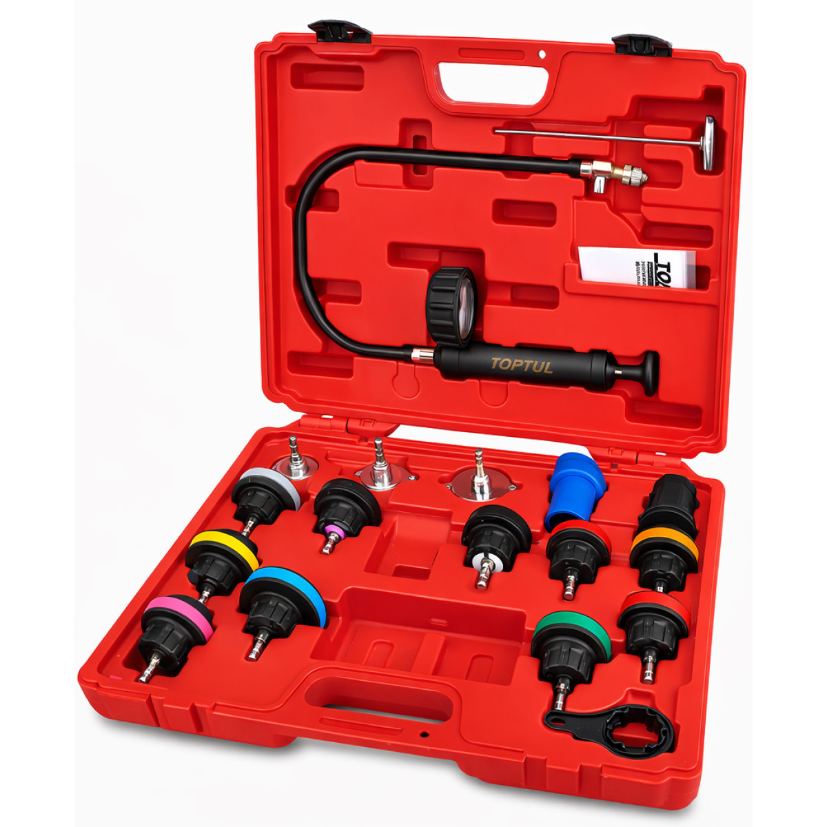Прилад призначений для перевірки герметичності системи охолодження автомобіля. Набір дозволяє швидко виявляти витоки в радіаторі, патрубках і з'єднаннях системи охолодження шляхом створення контрольованого тиску за допомогою ручного насоса з манометром. Адаптери з кольоровим маркуванням забезпечують швидкий підбір відповідної кришки для різних типів радіаторів. Усі елементи виготовлені з міцного матеріалу Nylon 66, що гарантує довговічність і стійкість до технічних рідин. Набір підходить для більшості сучасних автомобілів європейського, азіатського та американського виробництва.