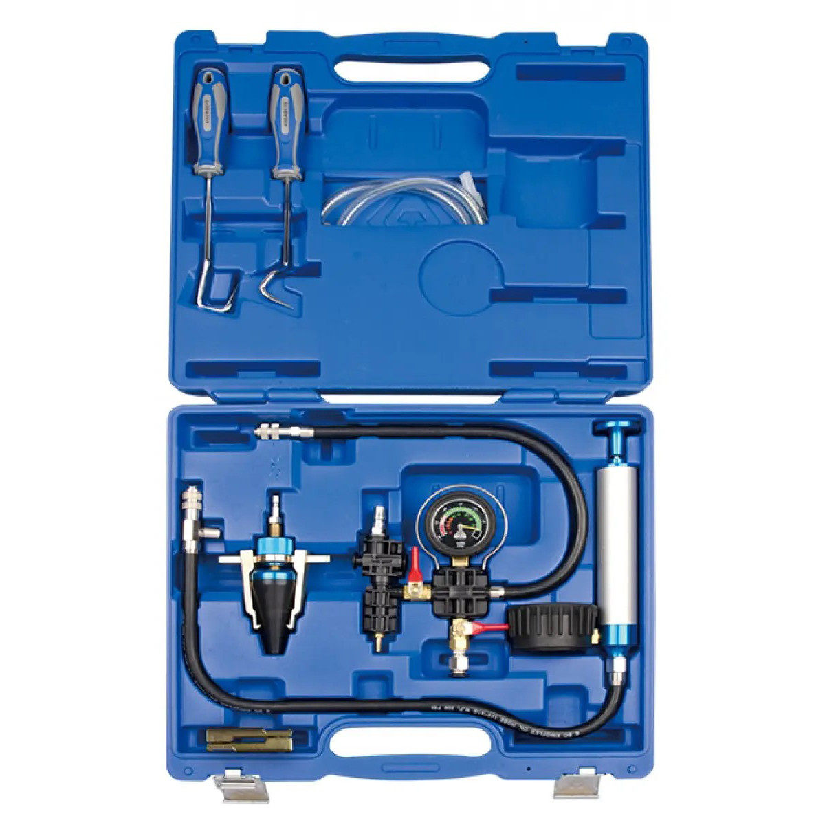 Тестер європейського типу призначений для перевірки герметичності радіатора та системи охолодження автомобіля. Інструмент дозволяє швидко визначати витоки охолоджувальної рідини, а також перевіряти працездатність елементів системи охолодження. Перевірка виконується шляхом створення контрольованого тиску в системі. Завдяки гумовому конусу інструмент може використовуватись без адаптерів і підходить для різних діаметрів горловини радіатора. Комплект оснащений ручною та пневматичною системами створення тиску, що робить його зручним для професійного використання на станціях технічного обслуговування.