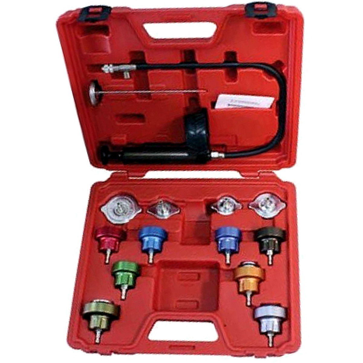 Універсальний тестер призначений для перевірки герметичності радіатора та системи охолодження автомобіля, а також для виявлення витоків охолоджувальної рідини. Прилад створює контрольований тиск у системі охолодження за допомогою ручного насоса з манометром, що дозволяє швидко визначити несправності радіатора, патрубків, з'єднань та інших елементів системи. Якщо показник манометра залишається стабільним протягом декількох хвилин - система герметична, якщо тиск падає - це свідчить про наявність витоку. Набір оснащений адаптерами для різних типів горловин радіаторів, що забезпечує сумісність із великою кількістю автомобілів європейських, японських та американських марок.