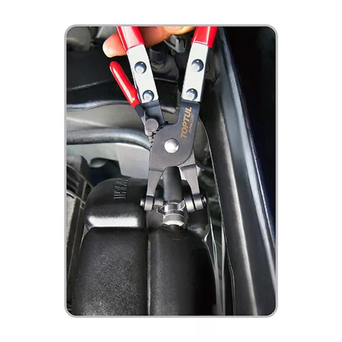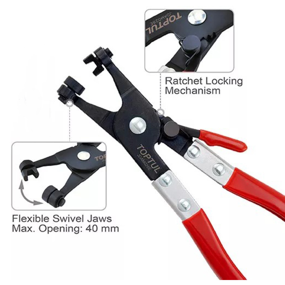 Кліщі призначені для зняття та встановлення пружинних і кільцевих хомутів на автомобільних шлангах. Інструмент використовується під час обслуговування паливних, охолоджувальних та інших магістралей автомобіля. Кліщі виготовлені із загартованої високоякісної інструментальної сталі, що забезпечує міцність і довгий термін експлуатації. Поворотні губки дозволяють працювати під різними кутами та забезпечують доступ до важкодоступних місць. Храповий механізм фіксації надійно утримує хомут у потрібному положенні, що значно полегшує роботу. Ергономічні рукоятки з покриттям TPR забезпечують зручний хват і зменшують втому рук під час роботи.